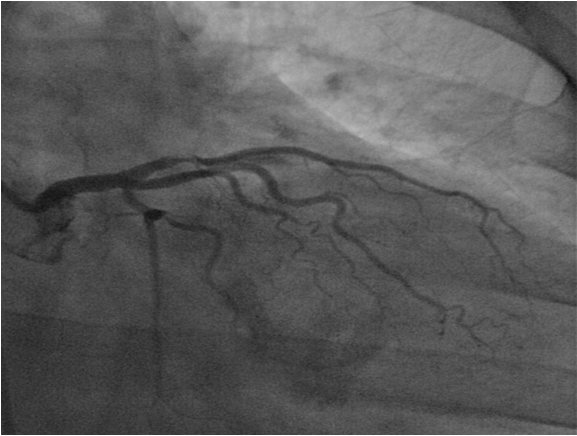 A 65-year-old Hispanic male with no prior medical history came to the emergency room for a new onset intermittent chest pain of 1 day in duration while working in his garage. The pain was described as chest tightness, mainly retrosternal, radiating to the left shoulder, associated with nausea and shortness of breath with no vomiting or diaphoresis. The patient denied any prior history of chest pain, orthopnea or paroxysmal nocturnal dyspnea. His last episode of chest was 1 hour prior to his arrival to the emergency room. The patient used to smoke about 1 pack a day for more than 15 years. Physical examination showed average built male in no distress, blood pressure of 135/80, pulse of 80 beat per minute, respiratory rate of 16, temperature of 98.8°C and sating 97% on room air. Cardiovascular examination was normal, as well as the remainder of the physical examination. On chest X-ray there was no cardiomegaly, infiltrates, or other abnormality. Initial EKG done in the emergency room while being pain free showed normal sinus rhythm, normal axis, narrow QRS, no Q-waves and isoelectric ST-segment. Initial laboratory work showed troponin of 0.09 (laboratory cut off 0.08) other laboratory examinations work were within normal including the lipid profile. Patient was admitted for serial EKG and troponin follow-up, he was pain free during his hospital stay, and in one of the next EKG about 8 hours after admission biphasic T-waves in V1-V6 was seen (Figure 1) with minimal elevation in the troponin level to 0.10. The patient was taken for cardiac catheterization for further evaluation in light of these changes. Cardiac catheterization showed 99% occlusion of LAD (Figure 2), with grossly patent right coronary artery. He subsequently underwent balloon angioplasty and a drug-eluting stent placement in the proximal portion of the LAD. A follow-up left ventriculogram showed anterior apical wall hypokinesis with left ventricular ejection fraction (LVEF) of 45%.The patient continued to improve clinically and did not have any further episodes of chest pain or any shortness of breath during his hospital course. His follow-up EKG showed resolution of electrical changes from before. He was discharged a day later on aspirin, prasugrel, metoprolol and atorvastatin. | ||||||
