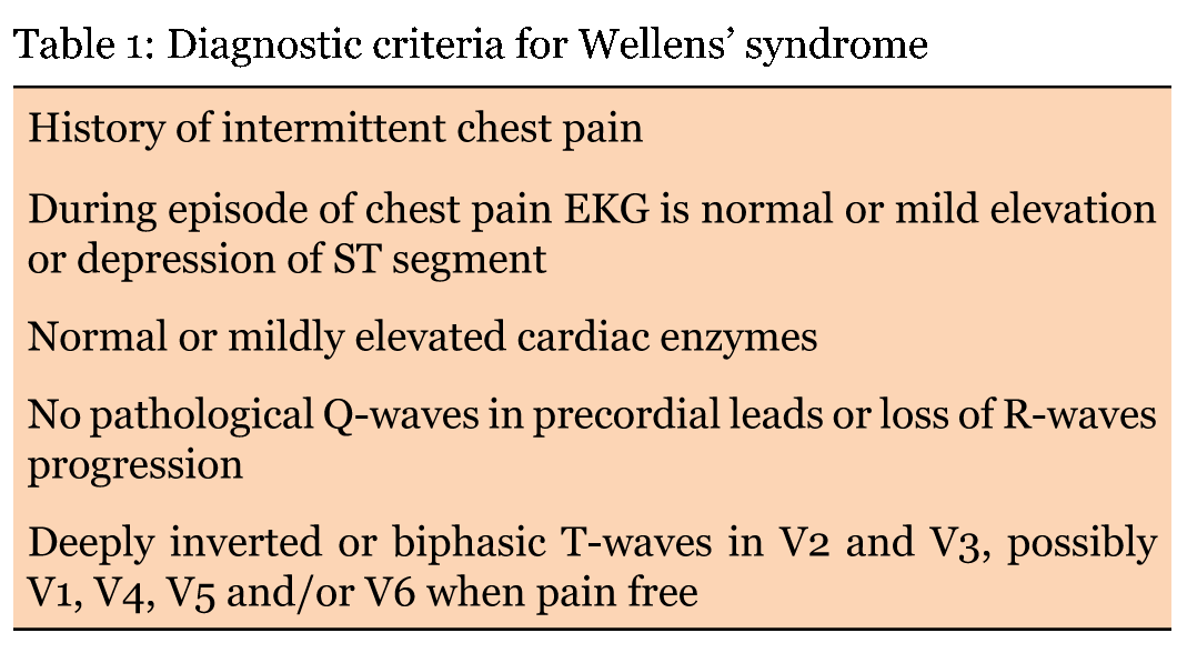 Biphasic T-wave, Chest pain, Cardiac death Elevated cardiac enzymes, Wellens' syndrome | ||||||