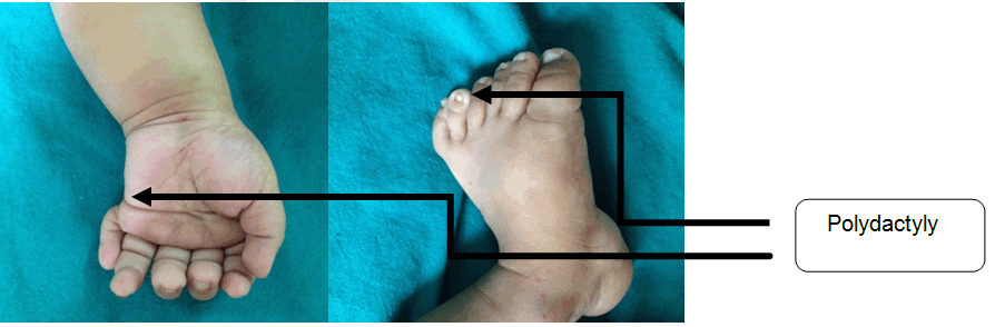 A nine-month-old male infant presented to a tertiary care hospital with complaints of inability to hold neck since five months of age, convulsions since three months, cough for a period of ten days and fever for two days. Convulsions were characterized by rapid forward bending of head and simultaneous movements of the arm suggestive of infantile spasms lasting for 2–3 seconds. Child was born of a non-consanguineous marriage with two well grown siblings. Mother did not attend the antenatal clinic. Infant was a full term normal vaginal delivery with birth weight of 3300 gms and was immunized till date. There was history of global developmental delay and the child belonged to a lower middle social class. On examination the patient was conscious, moderately built and nourished with a heart rate 112/min, respiratory rate 54/min, temperature 98.6°F and blood pressure 94/50 mmHg. Anthropometric measurements were normal for his age. On head to toe examination there was prominent forehead, bi-temporal hallowing, bilateral ptosis, upturned nares and low set ears. Polydactyly was noted bilaterally in both the upper and lower limbs (Figure 1). Other dysmorphic features revealed micrognathia, thickened upper lip, high arched palate and umbilical hernia (Figure 2). Cranial nerve involvement was in the form of bilateral ptosis with no response to sound and dysphagia with feeding difficulties. There was hypotonia with absent superficial reflexes and brisk deep tendon reflexes. There were no signs of meningeal irritation or cerebellar involvement. Other systems revealed bilateral crepitations along with hepatosplenomegaly. Hemoglobin was 8.9 g/dl, total leucocyte count 30,000/mm3 with neutrophils 64.3%, lymphocytes 30.2%, eosinophils 1.2%, monocytes 4.1% and platelets 6.01x105/mm3. The peripheral smear was suggestive of microcytic hypochromic anemia with neutrophilic leukocytosis and blood culture report was negative. Chest X-ray was suggestive of bronchopneumonia. Thyroid profile, serum electrolytes, calcium, alkaline phosphatase, liver and renal function tests were normal. Magnetic resonance imaging (MRI) scan of brain showed smoothening of the cortical surface of bilateral cerebral hemispheres with hypoplastic sulci and broad flattened gyri. The cerebral cortex was thickened, smooth well defined grey-white matter differentiation noted along with bilateral Sylvian fissures appearing shallow. All these features were suggestive of lissencephaly type I (Figure 3) Cranial ultrasonography did not reveal any abnormality. A computed tomography (CT) scan of abdomen and pelvis showed left sided gross hydronephrosis without hydroureter and marked thinning of cortex which was suggestive of pelvi-ureteric junction (PUJ) obstruction. An abnormal sleep EEG with right to left asymmetry and left occipital epileptogenesis was noted. Echocardiography and karyotyping were normal. The patient was administered injectable ceftriaxone (75 mg/kg/day) for 10 days. Syrup phenobarbitone (5 mg/kg/day) was started due to repeated episodes of convulsions. A surgical intervention for hydronephrosis has been planned. Classical dysmorphic features and type 1 lissencephaly characterized him as MDS. | ||||||