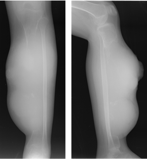 The symptoms initially present with nonspecific characteristics and its variety of the symptoms is related to location and extent of the disease. Pain is the most common clinical manifestation reported. It was in accordance to this case where the patient was presented with painful lump on her left lower leg. The onset of the clinical sign and symptom is insidious with slow and progressive characteristic. The patient usually tolerates symptoms for many years before seeking medical attention because of this characteristic of clinical manifestation as seen in this patient [5]. However, some of the patients present with swelling with or without pain as local swelling being the second most common symptom to appear. In addition, this case also showed that involvement of the anterior tibial surface can produce bowing of the tibia [6]. Based on radiographic assessment, adamantinoma is an osteolytic type with mono or multi-loculated lesions. In accordance to its benign characteristics, it is well circumscribed with septa and a peripheral condensation may appear. It is usually appear in the diaphysis or metaphysis of the anterior tibial. The lesion usually grows intracortical and it may spread longitudinally. However, it does not rule out the possibility of cortex destruction and marrow cavity invasion of the tumor [7]. The MSCT examination could reveal the characteristics of the lesion better than plain radiograph and can also detect another tumor site invisible on plain radiographs. The differential diagnosis based on plain radiograph examination including fibrous dysplasia and osteofibrous dysplasia [2]. . The patient in this case had tumor in her left leg which develops progressively after the first excision seven years ago. This might be due to inadequate attempts of removal where incomplete resection may result in higher recurrence rate up to 30% in the period of 85 months. Therefore, adamantinoma is suggested to be treated with wide surgical excision and reconstruction or amputation since its likelihood of healing is high subsequent to radical treatment [2] [3]. If early diagnosis is successfully made, wide local excision with a substantial margin of normal bone is still acceptable [8]. However, if there has been more than one recurrence or in large tumor with extension to the surrounding soft tissues, radical resection or amputation is advisable as shown in this patient where knee amputation was performed [9]. Adamantinoma is a low-grade malignant tumor of epithelial origin which metastasizes late. This tumor is insensitive to radiation and has capabilities of metastasis, especially to the lung. [8]. Metastases including in lung or lymph nodes are rare and can occur in 10–20% of patients. Pulmonary metastases are more common that regional nodal metastases from this tumor. It is not uncommon to develop distant metastases even up to 10 years after detection of the primary [3] [5]. This was in accordance with this case, where the main reason to seek medical management was due to difficulty in breathing and it was correlated with repeated local recurrences that might be due to inadequate primary excision of the tumor. However, it is difficult to evaluate its true metastatic potential due to several reasons such as long term follow-up, low number of the case, and slow growing nature of the tumor [5]. Several reports in literature have described metastasectomy for pulmonary lesions in both curative and palliative settings with good results. Mean survival of patients with metastatic disease is reported to be 12 years. There appears to be no definitive role for radiotherapy or chemotherapy [10]. Due to its excellent prognosis, it is crucial to diagnose this rare bone tumor in the early stage. It can be achieved by histologic examination, where this tumor can be distinguished easily. However, not only this tumor is rare, the heterogeneity of the tumor presentation may lead to confusion in some cases. On the histologic examination with inadequate sample taking, epithelial component may be seen only focally in the differentiated adamantinoma case, therefore in some cases, extensive sampling of the tumor is mandatory [11]. The challenge in making diagnosis and preparing proper management emphasizes that clinicopathological conference among orthopedic surgeon, pathologist, and radiologist was very important to ensure the patient get the best treatment available in musculoskeletal tumor cases. At the moment where the diagnosis is certain, resection with wide surgical margins or amputation can be applied to the patient.. | ||||||