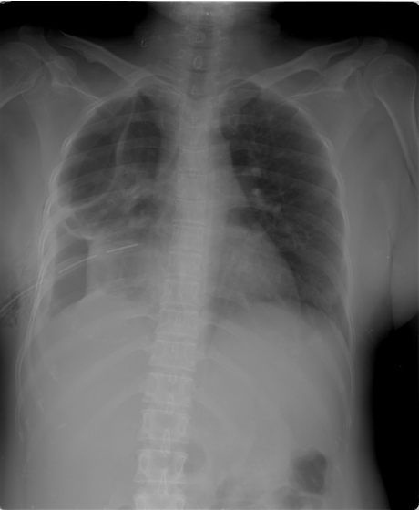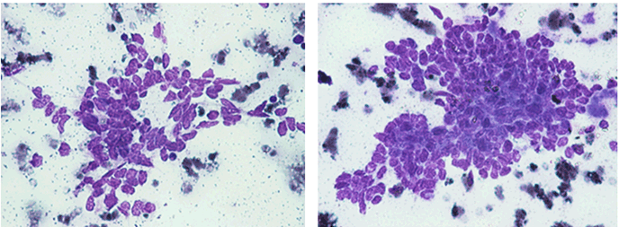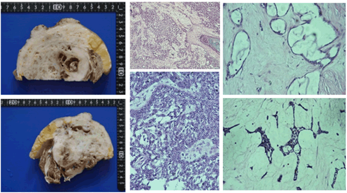 A 35-year-old Indonesian mongoloid female patient presented with a painful lump in her left leg. She had history of lump in her left leg since seven years prior to admission. Initially, the lump was only 1 cm in diameter. There was no history of trauma. The patient was initially treated by general surgeon, and had undergone excision of the lump. After the surgery, recurrence occurred and the lump developed gradually. Within seven years, the patient did not routinely visit hospital to have the condition of the lump checked. One week prior to admission, the patient complained about difficulty in breathing. She came to a primary hospital and was found to have a pleural effusion in her right lung and chest tube was inserted. She was then referred to our hospital. On the physical examination, a 10x10x5 cm hard tender mass was found in the left lower leg (Figure 1). Range of movement (ROM) in the left knee joint was full, but in the ankle joint, the ROM was limited. Laboratory results including tumor marker were unremarkable. Plain radiograph of the left leg showed lytic lesion in diaphysis and metaphysis of the left tibia with osteodestruction of tibia and extension to the surrounding soft tissue (Figure 2). A chest radiograph was performed (Figure 3) which showed bullae in the superior lobe of the right lung, pneumothorax, fibroatelectasis in the middle lobe of the right lung, and right pleural effusion. A chest MSCT showed hydropneumothorax and multiple bullae of the right lung and solitary nodule in the left lung suspected to be a distant metastasis from the primary tumor site (Figure 4). The patient was assessed with hydropneumothorax of the right lung caused by possible malignancy. A fine needle aspiration biopsy (FNAB) of the lesion in the left leg then performed with the result of clustered tumor cells within a group, with small cells with atypia, small amount of cytoplasm, spindle nucleus with hyperchromasia with background of lymphocyte and erythrocyte (Figure 5). A clinicopathological conference was then arranged with a recommendation of transfemoral amputation. A transfemoral amputation was then performed and the histopathological result showed a pattern of epithelial tumor with solid arrangement and infiltration to surrounding tissue, including to the upper dermis. The observation of the cells showed small to moderate cell sizes, small amount of cytoplasm, round to spindle nucleus with small amount of mitosis. The conclusion of the histopathological examination was islands of epithelial cells in a densely-populated stroma of spindle cells suggesting adamantinoma (Figure 6). The positive cytokeratin was found in the immunohistochemistry on the tumor cells and it was also relevant with the diagnosis of adamantinoma (Figure 7). | ||||||