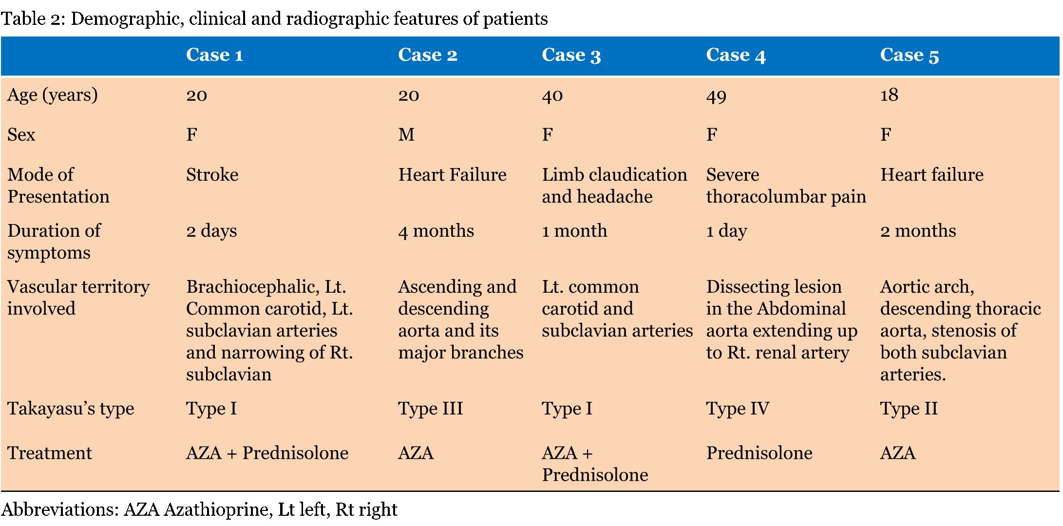 We report five cases of TAK that were seen over a period of four years. All five had diverse symptoms depending upon the affected arterial territory and variably raised inflammatory markers such as ESR and CRP. The most common finding was absent or diminished upper limb pulses in four of these patients and the clinical presentation included hemiparesis due to stroke, shortness of breath secondary to congestive heart failure, limb claudication and acute severe thoracolumbar backache. A brief description of the demographic features, clinical and radiological parameters have been given in Table 2. Case 1 Case 2 Case 3 Case 4 Case 5 The two patients with heart failure were the youngest among the five with low BMIs. Radiological findings classified two of them as having type-I, and other three as Takayasu's type-II, III and IV disease (Table 2). One patient was treated with steroid (prednisolone) alone, which was gradually tapered off in two years. Two patients received immunosuppression with azathioprine (AZA) alone, as they had severe heart failure; the other two were given AZA with maintenance dose steroids. These patients are being regularly followed-up; and are symptomatically improved. | ||||||