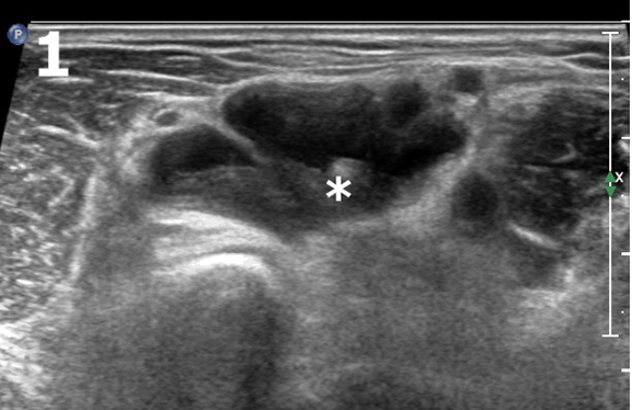 A 63-year-old Chinese female with seropositive rheumatoid arthritis (RA) presented with three days history of painful left forearm swelling and fever after switching to anti-tumor necrosis factor therapy for two months. There was no recent history of injury reported. Physical examination showed a swelling at the antecubital area which was tender on palpitation. X-ray of elbow and forearm were normal. Blood test showed elevated C-reactive protein 108 ng/L ( <5 ng/L) and ESR 119 mm/hr (3–28 mm/hour). Initial diagnoses were cellulitis, inflammatory lesion or soft tissue mass. Ultrasonography demonstrated a poorly compressible, well-circumscribed anechoic collection with both solid and fluid component surrounding the distal biceps tendon (Figure 1), over the anterior aspect of cubital fossa (Figure 2) with power Doppler signals. The elbow joint was normal without synovitis or effusion. Sonographic features suggestive of bicipitoradial bursitis need to rule out septic bursitis. Ultrasound-guided aspiration and decompression of the lesion was performed, yielded slight blood-stained fluid, both bacterial and mycobacterium culture was negative. Her fever responded to course of antibiotics and anti-inflammatory drugs. The swelling completely resolved after one week. | ||||||