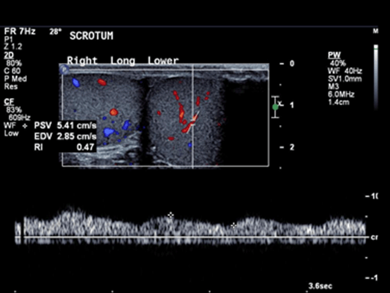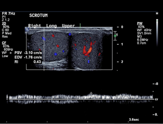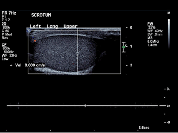 A 14-year-old boy presented to the emergency department with sudden onset of left sided testicular pain after playing soccer. He did not report any trauma to the scrotum and he was asymptomatic during the game. He did not have any urinary symptoms. On examination patient had generalized tenderness on the left hemiscrotum. A separate palpable lump also felt in the right hemiscrotum, which was not tender. Ultrasound of the scrotum showed polyorchidism with two distinct testes within each hemi-scrotum. The upper left testis measured 3.4x2.5 cm with no Doppler flow to the testis and adjacent hyperemia in the epididymis (Figure 1). The lower left testis measured 1.7x3.3 cm with decreased Doppler flow (Figure 2). The right hemi-scrotum contained two distinct testes measured 2.3x2.6 cm in the right upper testis (Figure 3) and 3.5x3.3 cm in the right lower testis (Figure 4). Scrotal exploration was performed immediately. Intraoperative findings revealed bilateral duplicate testis with sharing epididymis and vas deferens between the supernumerary testis and the other testis in each hemi-scrotum. Left sided upper testis was found to be torted with a 720 degrees twist. The testis was reduced and was found to be viable after reperfusion. Orchidopexy was performed for all fours testes. Patient had an uneventful recovery and was discharged the day after. | ||||||