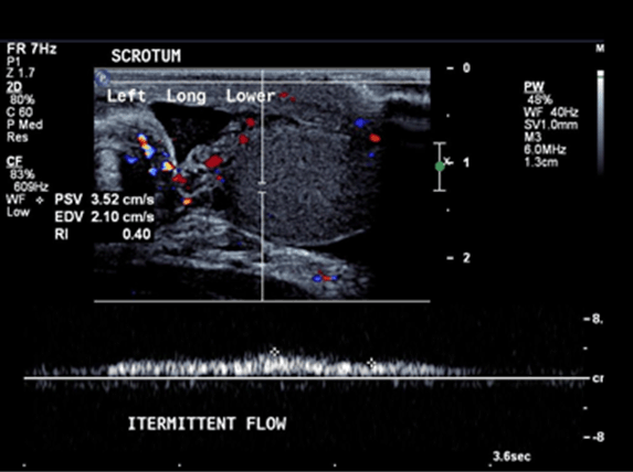 | Testicular torsion in a patient with four testes and the ultrasound findings | ||||||