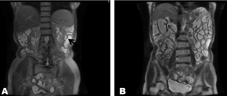 A previously healthy 74-year-old woman presented to our department of gastroenterology with unclear weight loss of 15 kilograms in six months. All laboratory tests and physical examination were unremarkable. Functional tests were positive revealing a malabsorption of glucose and fructose. This finding drew our attention to gastrointestinal tract. Diagnostic procedures including upper and lower gastrointestinal tract endoscopy and Computed tomography (CT) scan of the abdomen were normal. A more detailed evaluation of small intestine was attempted with a capsule endoscopy. The examination could not be completed, as the capsule remained stuck in jejunum for several hours. Our first interpretation was an underlying partial small bowel obstruction or a functional small bowel disorder which could not be detected in the computed tomography. In order to further investigate this hypothesis, we performed an MRI-Sellink. The MR enteroclysis (Sellink) is an MRI examination of abdomen with high sensitivity in detecting small bowel alterations and supplies information regarding anatomic regions not reachable with endoscopy. The MRI-Sellink showed multiple small intestine diverticula which were mainly present in the middle part of the abdomen right underneath the abdominal wall (Figure 1A-B). The conventional upper and lower endoscopy could not reach these parts of jejunum and ileum and a double-balloon enteroscopy was not performable due to technical reasons. Conservative management with antibiotics and dietary alterations was initiated. In our case, no satisfying response was reported, so that a surgical intervention was decided. After having the most of her intestine diverticula surgically removed, the patient gained her normal weight again. | ||||||