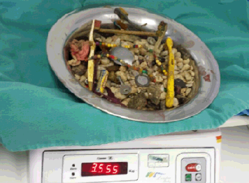 A 49-year-old male, schizophrenic patient, was presented to the emergency department. His relatives informed a progressive hyporexia over a four-month period associated with post-prandial fullness and a 10-kg weight loss. His past medical history was remarkable for metal pica (coins) two years before. Physical examination revealed mild pallor, epigastric bulging which was dull to percussion and an enormous hard, irregular, palpable mass, extending from the epigastrium to the left iliac fossa. Upon mobilization of the mass, a peculiar sound was produced, which was a clue for the diagnosis. Plain abdominal radiograph showed no signs of intestinal obstruction and a dilated stomach with a giant radiopaque bezoar containing different-sized grouped smaller images. This finding was another important evidence for the diagnosis (Figure 1). The patient was taken to open surgery, with evidence of a grossly dilated stomach (Figure 2) and performance of a longitudinal gastrotomy (Figure 3), manual removal of the foreign bodies (Figure 4) and a two-layer suture. At closer examination of the gastric mucosa, two superficial ulcers were identified, at the lesser and greater curvature, most likely due to contact with the sharp objects. There was neither any evidence of foreign bodies in other organs nor any complications. A 3.5-kg bezoar (Figure 5) comprised diverse objects: one plastic bag, two batteries, three lighters, six toothbrushes, some shoelaces, pens, coins, keys, spoons and necklaces, but predominantly stones in countless number. The patient's postoperative evolution was uneventful, with multidisciplinary care. Additionaly, he was cared for under close vigilance, with physical and chemical restraints to avoid pica. The diet was resumed in the third postoperative day and he was transferred on the seventh day to a referral psychiatric hospital. | ||||||