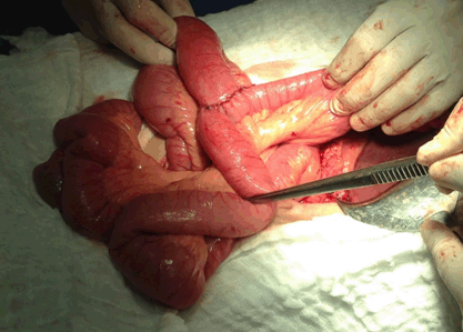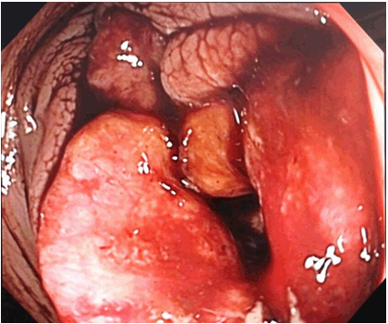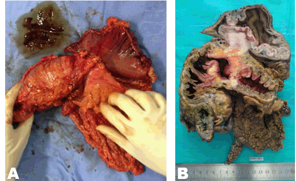 A 61-year-old male arrived at our emergency department complaining of abdominal pain for the last 30 days. The pain was poorly localized and characterized. It worsened in the 24 hours prior to seeking medical care. Patient was also complaining of chronic bloody diarrhea, mostly melena. Had only one episode of bright red blood per rectum, and one episode of vomit (digested food with no blood), both occurring in the 24 hours prior to seeking medical care. Patient uses ethanol and tobacco chronically. He was admitted for investigation. On admission laboratory examinations showed hemoglobin 3.5 g/dl and hematocrit 11.2%. The patient was immediately submitted to blood transfusion. During hospitalization, abdominal computed tomography scan showed situs inversus with signs of dextrocardia, an expansive, concentric and mucosal lesion located in the gastric antrum, left urinary tract calculus and left hydronephrosis (Figure 1). The first upper endoscopy showed an infiltrative lesion in the gastric antrum. The patient presented hematemesis followed by hemodynamic decompensation eight days after upper endoscopy. He was resubmitted to an upper endoscopy, which revealed a gastrocolic fistula, and was maintained with a nasogastric tube draining fecaloid secretion. Gastric infiltrative lesion was biopsied in the first upper endoscopy; the results were released nine days later and showed an ulcerated and well differentiated adenocarcinoma of the gastric antrum, with tubular pattern. Colonoscopy revealed an infiltrative and circumferential lesion in the transverse colon, occupying 90% of its lumen (Figure 2). After diagnostic investigation, patient was submitted to resection of the gastric antrum, cecum, ascendant colon and transverse colon – 2/3 of its extension (Figure 3A-B). It was made an anastomosis between the terminal ileum and the distal transverse colon, and a Roux-en-Y anastomosis to connect stomach and intestine (Figure 4). The patient presented good recovery in the postoperative period. Histopathologic examination of the resected portion showed adenocarcinoma of the transverse colon penetrating the gastric wall, and gastritis. Two out of twelve examined lymph nodes from the surrounding fat tissue were affected. Postoperative histopathology did not show adenocarcinoma of the gastric antrum. | ||||||