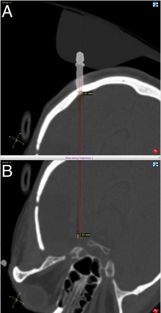The patient is a 58-year-old male who originally presented to an outside hospital with new-onset seizures at the age of 43. Workup revealed a low-grade tumor in the left lateral temporal lobe. He underwent a focal resection of the tumor and postoperative MRI revealed gross-total resection. He was seizure free for one year after surgery and then developed recurrence of seizures of the same semiology. Of note, the patient had a history of lumbar decompression and fusion for back pain and developed chronic low-back pain requiring high doses of dilaudid and fentanyl. Patient presented to our institution with 14 years of medically refractor focal epilepsy and chronic low-back pain requiring high doses of dilaudid and fentanyl. Subsequent video-electroencephalogram (vEEG) data revealed a single focal area of cerebral dysfunction in the mesial temporal lobe adjacent to the prior resection cavity. The patient had failed multiple medications in the past and had no improvement in seizures. He had significant side effects from the medications and stopped taking them for this reason. Patient had 3–5 seizures per day prior to surgery. The patient was offered an open resection of the residual epileptogenic foci or laser-induced thermal therapy (LITT) to treat the presumed ictal onset zone. He elected to undergo laser ablation to minimize post-surgical pain because of the patient's chronic pain and opioid dependence. The patient underwent a preoperative volumetric MRI for stereotactic navigational purposes. The patient was placed under general anesthesia and then placed in a lateral position. We used the ROSA robot (MedTech Surgical, Inc, Montpellier France) to assist with implantation of a laser cannula through a transoccipital approach to the mesial temporal lobe. The patient was placed in a Leksell stereotactic head frame (Elekta, Crawley, United Kingdom) to connect him to the robot (i.e., not for stereotactic navigational purposes). Additionally, bone fiducials were used because facial registration is less accurate when the patient is in the lateral position. A mesial temporal trajectory was planned with the ROSA navigation software, including the entry point and trajectory needed to reach the target (Figure 1). A percutaneous burr hole was made on the scalp at the entry point and a PMT skull bolt (PMT Corporation, Chanhassen, Minnesota) was placed in the correct trajectory. We passed a cannula through the skull bolt and advanced it to the predetermined depth (Figure 2). The laser applicator was then placed within the cannula and secured. The patient was then transported to the MRI suite for the remainder of the procedure. Imaging confirmed correct placement of the laser applicator and then the LITT commenced. The Visualase thermal therapy system (Visualase, Inc.) consists of a computer, a 15 W 980 nm wavelength diode laser, a cooling pump, and a disposable laser applicator that is approximately 1.65 mm wide [2]. Designated "safety points" would shut off the laser if the region of the brain near the laser applicator or surrounding parenchyma reached approximately 90°C, or if the protected cerebral structures reached temperatures around 50°C. The laser was pulsed at roughly 9 W for 60–90 seconds intervals. The laser cannula was pulled back and ablation continued until an adequate region was ablated. When the surgeon deemed the region to be sufficiently ablated, the applicator and bolt were removed and the wound was closed. There were no complications associated with surgery and the patient was discharged on postoperative day one. The patient required no additional pain medications outside of his normal chronic pain regimen. During his follow-up appointment, he had no pain related to the surgery and has denied any seizures since surgery. | ||||||