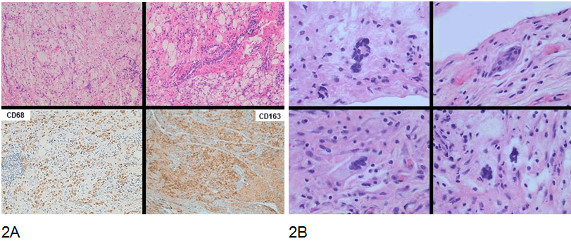 A 29-year-old female with a two-year history of central diabetes insipidus and hypothyroidism presented with progressive diffuse abdominal pain. A computed tomography (CT) scan of the abdomen (Figure 1) revealed diffuse infiltrative disease likely fibrosis. Her abdominal pain worsened over time and she underwent an exploratory laparotomy, which revealed an extensive process resembling severe fibromatosis versus carcinomatosis. Due to marked inflammation surrounding the appendix and right ovary, the patient underwent appendectomy and right oophorectomy. In addition, multiple biopsies were taken of the peritoneum and omentum (Figure 2A-B). The pathologic diagnosis was reported as a fibrohistiocytic process. The patient's postoperative course was complicated by bilateral hydronephrosis. Cystoscopy and ureteroscopy with bilateral ureteral stent placement was performed with no improvement. Ultimately required bilateral nephrostomy tube placement; renal function continued to deteriorate and she was started on hemodialysis. Shortly thereafter, she developed a deep venous thrombosis of the left upper extremity and anticoagulation with warfarin was instituted. At the same time, the patient developed severe abdominal pain. A CT scan of the abdomen revealed a large bowel obstruction requiring surgical intervention with partial colectomy and colostomy. The patient was subsequently transferred to our institution for further evaluation and higher level care. Two weeks after anticoagulation was started, the patient developed bleeding from the colostomy site. However, she remained hemodynamically stable. The gastroenterology service evaluated the patient and determined that the risk of perforation from an EGD and colonoscopy to find the source of bleeding or from performing a new biopsy was significantly high. It was further determined that the site of bleeding was at the colostomy stoma. As the patient's primary diagnosis remained unclear and CT images were reviewed. A mass at the inferior vena cava right atrium was identified (Figure 3). The initial transthoracic echocardiogram demonstrated a dimension 2.5x2.4 cm, non-mobile mass, extending almost from the entrance of the IVC to the posterolateral wall of the right atrium (Figure 4). An MRI scan was attempted however, patient, did not tolerate the study and it was aborted, the few images captured did demonstrate evidence of the mass (Figure 6). A cardiac CT scan allowed us to have a better visualization of the mass. It was found to be 3.9x3.8 cm in dimension, intraluminal within the right atrium, centered on the crista terminalis and infiltrating into the right atrial-ventricular groove and the intra-atrial septum (Figure 5). A cardiac biopsy was performed and revealed a process not unlike what was seen in the abdomen. This tumor was comprised of bland-appearing fibroblast like cells characterized as medium-sized, with oval to stellate nuclei, fine chromatin, inconspicuous nucleoli, and ample amphophilic to eosinophilic cytoplasm with indistinct cell borders. These cells were scattered within a myxoid to histiocytic background. Like the intra-abdominal tumor, these cells were immunoreactive for CD68 and CD163 (Figure 2) and (Figure 7). These histologic findings, combined with the clinical presentation, was most consistent with non-Langerhans cell histiocytosis, otherwise known as Erdheim–Chester disease. Bone scan was performed and no evidence of osteosclerosis or infiltrative disease was found (Figure 8). The patient's clinical course had been most complicated by the aggressive peritoneal and retroperitoneal proliferation, which had caused bowel obstruction and ureteral obstruction, with hydronephrosis and renal failure, and cardiovascular infiltrating mass extending from IVC into the right atrium with no hemodynamic compromise. However, after initiation of therapy with Anakinra, a recombinant IL-1 receptor antagonist; she showed a dramatic clinical improvement. Ultimately, the patient responded well to therapy and was send home with plan to follow as outpatient. | ||||||
