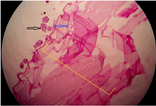 A case of 45-year-old female which was operated for laparoscopic cystostomy for single liver hydatid cyst (6×5 cm in right anterior lobe of liver, diagnosed by CECT abdomen). After four months of laparoscopic cystostomy, she was admitted in our hospital with complain of swelling and pain at the abdomen over previous laparoscopic port site scar. On per abdominal examination, there was a single 5×5 cm sized tender swelling at right hypochondrial port site scar with inflamed and reddish overlying skin. Ultrasonography (USG) scan of abdomen suggestive of 5×4×4 cm sized hypo echoic lesion with internal septation at the anterior abdominal wall at port site with extension to right sub diaphragmatic space with normal liver. Rest of biochemical and hematological investigation were normal. Initially, we suspected an abscess at port site, so we had planned for incision and drainage of material. But during operation, we came to know that the material resemble the endocyst and brood capsule of hydatid cyst. So we had removed all material and site washed with 0.5% cetrimide solution and flower tip malecot catheter inserted under USG guidance into the sub diaphragmatic extension. There was approximately 30 cc output from the malecot catheter for two days, and it was removed on fourth postoperative day. Wound at port site healed secondarily within two weeks. We had sent material for histopathological examination which was reveled hydatid cyst material (Figure 2). | ||||||