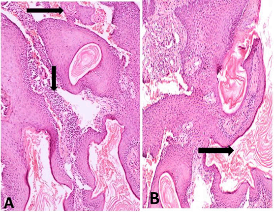 A 13-year-old girl patient was reported to our dental college complaining of a symptomless progressive enlargement of the palatal mucosa accompanied by an abnormal taste for last six months. Clinical intraoral examination revealed a bony swelling of 1.5x2 cm mainly bulging buccally related to the right maxillary anterior teeth. The overlying mucosa was reddish with a minor degree of laceration. On palpation the swollen area showed egg shell crackling. Aspiration of the swelling yielded turbid cystic fluid. Radiographic examination based on the available panoramic view revealed a unilocular expansile lucency which was well defined and partially corticated. The radiolucency involved the roots of both maxillary central and lateral incisors and extended up to premolar area. No destructive osseous changes were, seen however, mild resorption of the roots of #11 and #12 was noted; along with a marked divergence of the roots of #12 and #14. The radiolucency was related to horizontally impacted tooth (Figure 1). There was no medical history of significance. Based on the clinical and radiographic findings, the initial diagnosis of odontogenic cyst was made and the lesion was subjected to histological examination. Histopathologic examination revealed a uniformly corrugated parakeratinized epithelial lining, however, some other areas showed partially uniform thickness with palisaded basal cells. A huge amount of keratin was seen filling the cystic cavity (Figure 2A-B). The epithelium exhibited basilar hyperplasia, hyperchromatism, pleomorphism, (Figure 2B), intraepithelial pearl formation (Figure 3A-B). There was discontinuity of basement membrane together with loss of polarity of basal cells in some areas (Figure 3B). The underlying stoma showed few epithelial cell nests and keratin pearls. Scattered chronic inflammatory cell infiltrate was present in the fibrous tissue capsule (Figure 4A-B) These histological findings led us to the diagnosis of odontogenic keratocyst which has undergone malignant transformation giving the diagnosis of well differentiated squamous cell carcinoma on top of keratocyst according to the presence of frank point of invasion as well as epithelial and keratin pearls in the underlying stoma. |