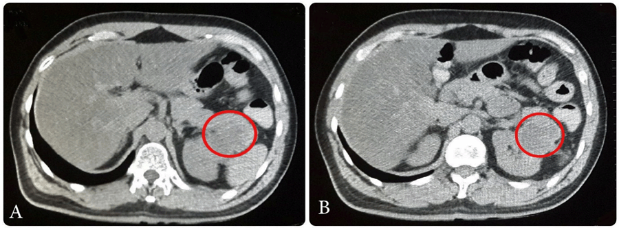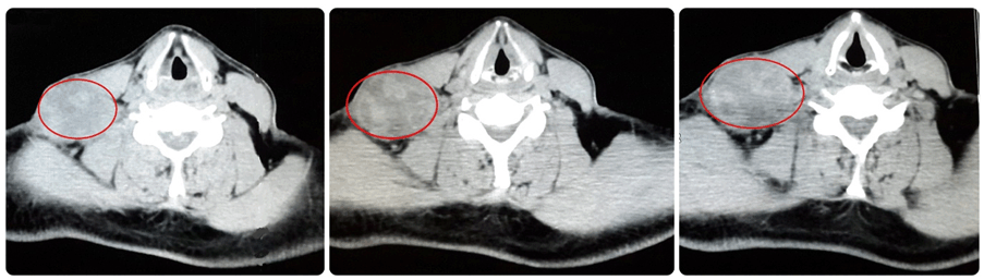 A 50-year-old male presented with history of hypertension and hemorrhagic stroke in 2012 with sequel of right hemiparesis. The patient presented with a right supraclavicular firm, incompressible and immobile swelling of 55 mm. Body computed tomography (CT) with contrast was done. It showed left renal mass in lower pole measuring 65x38 mm as a focal bulging of the renal contour, mainly isodense to the renal parenchyma. The corticomedullary phase clearly showed renal malignancy which was moderately and heterogeneously enhancing (Figure 1). Heterogeneous contrast enhancement on imaging should always suggest renal malignancy preoperatively. There was a secondary heterogeneous lesion in the right supraclavicular hollow measuring 56x42 mm with central necrosis (Figure 2). Fine needle aspiration (FNA) of right supraclavicular tumor showed metastasis of well differentiated adenocarcinoma. His biopsy was unsatisfactory. He was evaluated by urology and oncology services so it was decided to like radiotherapy for local control and subsequen treatment with interferon α 5 million IU/week and sunitinib 50 mg/day for one year for down staging (six weeks cycles). Treatment was started with pazopanib 800 mg/day. The lesion increased in size for six months. He had poor clinical response. He was evaluated by head and neck surgeons and surgery was done: resection of cervical tumor of level V and right cervical lymphadenectomy of levels II, III, IV, V (Figure 3). The surgery was done on third day of hospitalization. Ambulatory monitoring was done by head and neck and oncology services. Microscopic study of respected lymph nodes revealed clear cell renal carcinoma (ccRc). After 45 days, laparoscopic nephrectomy was performed. The immunohistochemical profile was the same for both the neck and renal tumor. No recurrences occurred after two years of follow-up. | ||||||
