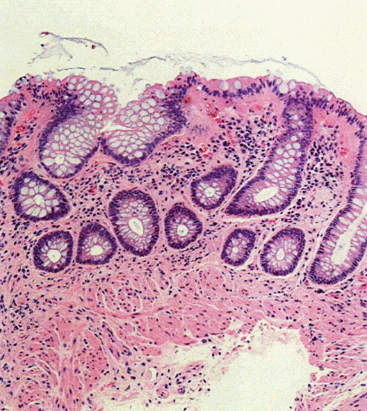 A 73-year-old female during the treatment of cryptogenic organizing pneumonia (COP) consulted our outpatient clinic complained of chronic diarrhea lasting more than six months. There was no body weight loss, and she did not feel severe abdominal pain. Twelve months prior consultation, prednisolone and lansoprazole were started to be administrated against COP. Since the patient had a past history of peptic ulcer, proton pump inhibitor (PPI) was also started against the adverse effect of corticosteroid therapy. Administration of corticosteroid and lansoprazole was also continued, because of repeating recurrence and improvement of COP. On physical examination, abdomen showed no significant abnormal findings. Stool color was normal, and stool occult blood examination was also negative. And stool bacterial culture did not show abnormal finding. Blood laboratory examination showed as following; white blood cell count 4,890/mL, hemoglobin 15.0 g/dL, platelet count 199,000/mL, total protein 6.7 g/dL, albumin 4.1 g/dL, AST 34 IU/mL, ALT 31 IU/mL, LDH 196 U/mL (normal range: 106–211) fasting blood sugar level 78 mg/dL, amylase 118 IU/L, Na 142 mEq/L, K 3.8 mEq/L, Cl 108 mEq/L, Ca 9.6 mg/dL C-reactive protein 0.0 mg/dL, CEA 1.1 ng/mL, CA19–9 12.4 U/mL, and KL-6 302 U/mL (normal range: 0–499). Esophagogastroduodenoscopy showed peptic ulcer scar formation. Colon endoscopic examination showed diffuse cloudiness with small fine granule-like surface change from rectum to transverse colon (Figure 1). Biopsy samples of colon and rectal mucosa revealed infiltration of inflammatory cells into mucosal layer. And submucosal layer and homogenous, amorphous deposition of collagen fiber was recognized under the surface epithelial cells (subepithelial collagen band) (Figure 2). The diagnosis of collagenous colitis was performed and administration of lansoprazole was discontinued. A few weeks later, watery diarrhea spontaneously discontinued. Six months later, treatment of COP was finished. No recurrence of COP and collagenous colitis after three year. | ||||||