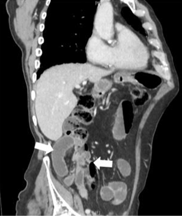 An 84-year-old male with no previous history of abdominal surgery presented to accident and emergency department with a one day history of intermittent abdominal pain. He denied any nausea or vomiting, however, noted a reduced stool frequency in the preceding two weeks. His past medical history included ischemic heart disease, cerebrovascular disease, diabetes, hypertension, pulmonary fibrosis, benign prostatic hyperplasia and he had an abdominal aortic aneurysm under surveillance. Initial assessment of the patient’s abdomen revealed no tenderness or distension and physiological observations were within normal limits. Blood results were unremarkable except for a mildly elevated C-reactive protein of 42. During a period of observation he experienced increasing pain and developed tenderness in the right iliac fossa. A computed tomography scan was performed, revealing a localized incarcerated segment of small bowel lateral to the cecum in the right paracolic gutter with upstream dilatation of small bowel loops lying anterior to the ascending colon. The associated localized mesenteric congestion and fluid surrounding the localized segment of small bowel in the right iliac fossa were suggestive of a paracecal hernia. The patient was taken to theatre for laparoscopy within 24 hours of admission. A paracecal hernia containing an obstructing loop of jejunum was identified between the cecum and lateral abdominal wall. Multiple adhesions in this area created a narrow necked blind ending ‘hernia cave’ in the right paracolic gutter. An adjacent internal hernia contained an unobstructed vermiform appendix. Laparoscopic reduction of the small bowel from the hernia was performed and adhesiolysis undertaken to prevent recurrence. The patient had an uncomplicated postoperative course, returned to baseline function and was discharged on the third postoperative day. | ||||||