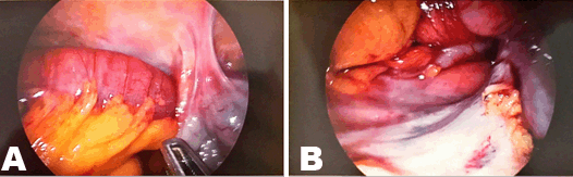A hernia is defined as the protrusion of a viscus through a defect in the wall of the cavity in which it resides. When bowel passes through a peritoneal defect or mesenteric aperture, it is known as an internal hernia [4]. Internal hernias account for up to 5.8% of presentations of small bowel obstruction, of which paracecal hernias make up only 6.6% [1]. The paracecal peritoneum develops once the midgut has completed migration. The result is formation of four paracecal recesses being formed. These are the superior ileocecal recess, inferior ileocecal recess, retrocecal recess and paracolic sulci. These all have the potential to form hernial orifices [5]. Symptoms of abdominal pain and vomiting from paracecal hernias are variable and depend on the degree of incarceration or obstruction. Often due to their anatomical location, they may be mistaken for other right iliac fossa pathology, such as appendicitis [1][4]. When there is diagnostic uncertainty, or if internal hernia is suspected, computed tomography scan is the preferred investigation of choice. Aside from confirming the diagnosis, this readily available imaging provides information about the presence of strangulation and ischemia as an aid to preoperative planning. The presence of a cluster of dilated small bowel loops, a transition point lateral to the cecum and congestion of mesenteric vessels raise suspicion for an obstructing paracecal hernia. The cecum can sometimes be seen to have been displaced anteromedially. Other imaging modalities such as plain X-ray films and contrast studies often provide limited information and may result in delayed diagnosis subsequently increasing the risk of complications [2][4][6] Laparotomy has generally been the preferred approach for the presence of small bowel obstruction, however, many studies including O’Connor et al. review of over 2000 cases have shown the safety and efficacy of laparoscopic surgery [7]. The debate over the approach is on-going because of the technical difficulties and potential complications associated with laparoscopic surgery in these patients. These include damage to distended small bowel loops and visualization of the transition point, making a high conversion rate to laparotomy and morbidity. However, benefits of laparoscopic surgery in small bowel obstruction have been shown, these are reduction in postoperative hospital stay, reduction in morbidity, reduction in adhesion formation and faster return to bowel function [7]. A recent review of published cases of paracecal hernias by Ogami et al. [3] highlighted that the vast majority of reported cases have been managed by laparotomy and that only three cases have been managed laparoscopically, none of which were performed within the UK. On reviewing these three case reports [3] [8] [9] all were performed after several days of conservative treatment which had not responded, in comparison to our patient who was operated on within 24 hours. All the cases showed viable bowel upon reduction of the hernia and no resections were required. The postoperative courses were uneventful with patients being discharged between 9 and 10 days postoperatively. In our case, the prompt diagnosis and early laparoscopic intervention had a reduced length of stay in comparison to the previously discussed cases. | ||||||