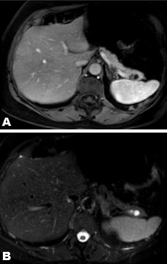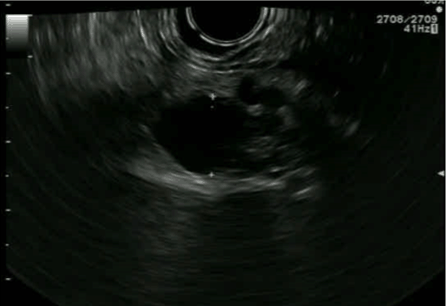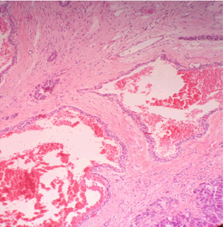 A 71-year-old female with a past medical history of thyroidectomy and diverticulosis presented to the emergency department with left iliac fossa pain. Computed tomography scan showed signs of diverticulosis without any complication and incidental finding of cystic lesion in the tail of the pancreas. The patient was transferred to our center for further follow-up and investigation. Clinical examination on admission revealed healthy looking women, comfortable, abdomen soft and no abdominal masses palpable. Blood tests including lipase, CEA and CA 19-9 were normal. Computed tomography scan and magnetic resonance imaging (MRI) scan showed a 19-mm cystic multi loculated lesion in the tail of the pancreas which was initially thought to be a serious cystadenoma. We decided to follow-up the lesions with MRI scan in three months’ time because of atypic characteristics of the lesion. Magnetic resonance imaging (MRI) at three month showed 24 mm cystic loculated lesion (increasing in size comparing to the last CT scan), well demarcated with a thick and contrast enhanced septa (Figure 1). No infiltration to the surrounding structure and no communication with the main pancreatic duct were described. Endoscopic ultrasound showed a 25-mm cystic lesion with same characteristics as on MRI scan and particularly did not find intramural nodule (Figure 2). For technical reason the puncture biopsy was not possible. Since a diagnosis of pancreatic mucinous neoplasia could not be ruled out, a decision to perform pancreatic resection was made. Laparoscopic distal pancreatectomy with splenectomy was done. Postoperative course was uneventful and the patient was discharged without complications five days after surgery. The histopathological report revealed hemorrhagic cystic lesion measuring 2 cm, pathological features resembling pancreatic hemangioma without any features of malignancy (Figure 3). | ||||||