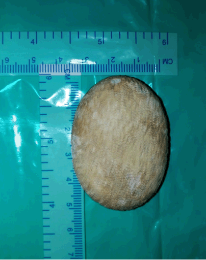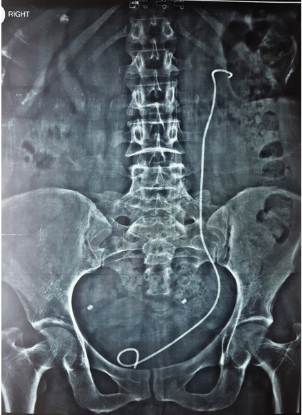A 35-year-old female presented in our outpatient department for complaints of left flank and lower abdominal pain, burning and increased frequency of micturition for four months. Six years back she had undergone left sided ureteroscopy at some other centre for ureteric stone clearance and after the procedure a double-J stent was placed. Patient did not turn up for stent removal. Two years back she also passed fragments of stent in the urine (stenturia). Ultrasound kidney, ureter, and bladder of the patient revealed essentially right sided normal kidney, while in left kidney there was a staghorn calculus of size about 25 mm, besides it there was a large bladder stone of size about 49 mm. Digital X-ray kidney, ureter, and bladder showed coiled ends of a double-J stent in the left renal pelvis and bladder region with formation of stones over it however entire shaft of the stent was missing (Figure 1). Her KFT was within the normal limit. Patient was managed by antibiotics according to urine culture sensitivity and by open cystolithotomy for bladder stone (Figure 2), and after one month of open cystolithotomy she underwent PCNL for the staghorn calculus, her postoperative recovery was uneventful both the time. Her latest digital X-ray KUB (Figure 3) dated 01/06/2017 showing complete clearance of stone and double-J stent in situ. | ||||||