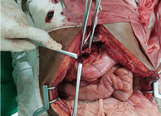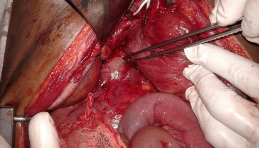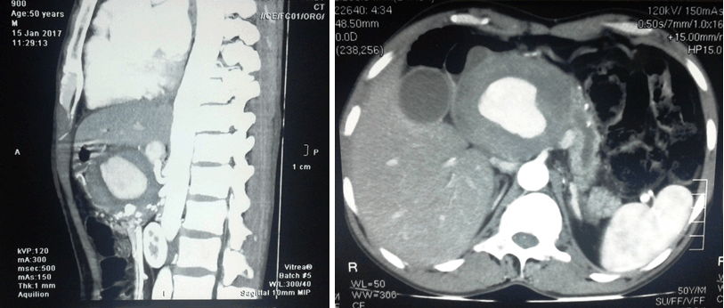 A 50-year-old male was presented to our hospital with a five-week history of persistent epigastric pain associated with indigestion weight loss, and melena. On physical examination he was icteric and had an epigastric tenderness but no palpable masses detected. Biochemical investigations revealed obstructive jaundice with elevated total (135.8 µmol/l) and direct bilirubin levels (114.2 µmol/l). Abdominal ultrasonography reported an aneurysmal dilatation (5.1x5.8x4.8 cm) in the epigastric region with wall thickness of 1.4cm. Upper gastrointestinal endoscopy demonstrated an ulceration of mucosa of second part of the duodenum with active bleeding (Figure 1). Contrast enhanced computed tomography scan of the abdomen showed a pseudoaneurysm in the superior pancreaticoduodenal artery. Superiorly there was a linear high density within the hypodense wall which could be contrast leak into intramural thrombus. Pancreatic head is compressed and there are multiple foci of coarse calcifications within the head of the pancreas. Pancreatic duct is dilated (9.1 mm). Second part of the duodenum is compressed by the lesion. Gallbladder is distended and common bile duct is dilated (1.3 cm). Hepatic artery originates directly from the aorta. An explorative laparotomy performed and aneurysmal dilatation of superior pancreaticoduodenal artery identified. Aneurysm sac opened and feeding artery ligated from inside. Two fistulous openings into second part of the duodenum and to the common bile duct identified and repaired (Figure 2) and (Figure 3). The patient was discharged one week later after complete recovery. | ||||||