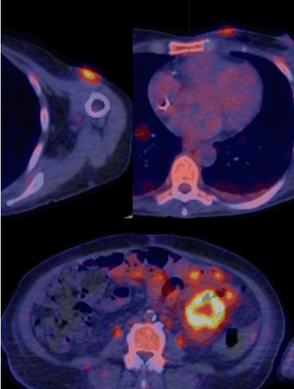 A 59-year-old female presented with weight loss, night sweats, and diarrhea since four months. Stool examination, serologic testing, esophagogastroduodenoscopy (EGD), colonoscopy (C-scope), and computed tomography (CT) scan of chest and abdomen were non-contributory. Diagnosed with celiac disease at 51, she had had no prior digestive symptoms despite poor adherence to a gluten free diet and persistently positive anti-tissue transglutaminase antibodies. Physical examination revealed cachexia, widespread erythematous maculopapular skin lesions, and no palpable lymphadenopathy. Laboratory examination showed hemoglobin 9.8 g/dL, mean cell volume 92 µm3, white blood cell count 5500/mL (lymphopenia at 300/µL), and serum albumin 2.2 g/dL. The PET scan showed intense FDG uptake in a left tonsillar mass with multiple FDG-avid subcutaneous lesions, and bowel and mesenteric involvement (Figure 1). The left tonsil and one of the cutaneous lesions were biopsied, revealing a CD8+ T-lymphoid cell infiltrate, most consistent with T cell lymphoma showing a CD4 negative, CD8 positive, and CD 56 negative cytotoxic phenotype. Balloon enteroscopy revealed a mosaiform small bowel mucosa with multiple clean-based ulcers throughout the jejunum. Biopsies were consistent with the tonsillar findings. A few days following admission the patient underwent a laparotomy for small bowel perforation, and was subsequently transferred to the intensive care unit where her course was complicated by recurrent gastrointestinal bleeding, septic shock and respiratory failure, leading to death. | ||||||