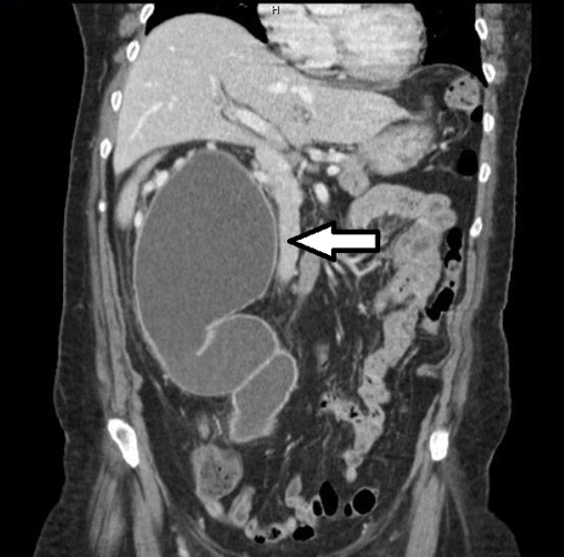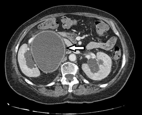 A 70-year-old female presented with right back pain and fever. Six months earlier was submitted to hysterectomy and bilateral salpingo-oophorectomy for an ovarian epithelial cancer (stage IA). On physical examination, she had chills, fever, and tenderness at the right costovertebral angle. Blood tests indicated acute renal failure and marked elevation of C-reactive protein. In renal ultrasound, a mild right hydronephrosis was identified, and the respective ureter proved to be impossible to visualize due to the presence of a large cystic-like structure (19 cm of longitudinal size). As there was a suspicion of obstructive pyelonephritis, a renal scintigraphy was performed indicating the presence of a significant unilateral obstruction. Non-contrast computed tomography (CT) scan showed a markedly distended right ureter (up to 9.5 cm in diameter) with tortuosity (Figure 1) and (Figure 2) (Figure 2), not evident in previous follow-up CT scan. No calculus or other anatomical urologic abnormalities were found. The patient underwent percutaneous nephrostomy, which drained 1500 cc of purulent fluid. Escherichia coli were isolated and adequate antibiotic therapy was instituted. The clinical condition of the patient declined progressively and had passed away after three days. | ||||||