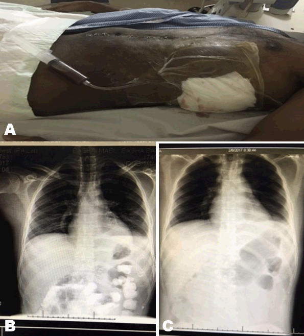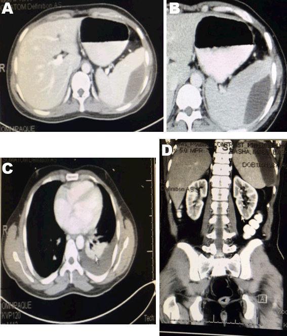 A 30-year-old Indian male presented to our emergency room, a RTA victim, with lower abdominal pain. Resuscitation started according to ATLS protocol and examination was unremarkable except for suprapubic tenderness, tear of glans penis and right side of scrotum. Laboratory workup showed raised renal functions. Focused assessment with sonography for trauma (FAST) showed mild free intraperitoneal fluid. X-rays showed bilateral lung contusions and pelvic fracture. Computed tomography (CT) scan without contrast was not done due to raised serum creatinine of 145 µmol/L and urea of 11 mmol urea per liter. Scrotal ultrasonography and Doppler were normal. Repeated hemoglobin was 8 g/dl, then ultrasound showed increased intra-abdominal fluid. He was prepared for laparotomy. 1.2 liters of free blood, normal solid organs except for 1 cm lateral capsular splenic tear with minimal bleeding were found. Splenic salvage was done with cautery and 2 pieces of pieces of local hemostats (Surgicel™). Resection anastomosis of 30 cm of ilium was done for transverse large mesenteric tear of the distal ileum. Wash with saline then, the abdomen was closed over drains. On the next day, he developed hematuria. Computed tomography (CT) scan with contrast showed normal solid organs. On day-10, blood workup and ultrasound were unremarkable. Drains removed and antibiotics were discontinued. He remained for wound infection care. On day-18, he had fever and subcostal pain. Clinically, he had mild left subcostal tenderness with no masses. Ultrasonography and abdominal contrast enhanced CT scan showed a subcapsular 12x6.5x3.6 cm splenic hematoma with no free intraperitoneal fluid, left pleural effusion and basal lung consolidation (Figure 1). Conservative treatment continued for 10 days and till complaining of pain. Follow-up CT scan showed no improvement. He was offered ultrasound-guided percutaneous drainage or splenectomy as alternative in case of failure of drain. 40 ml of turbid blood was aspirated and sent for culture. A 16 F pigtail catheter was left inside the cavity. Post procedure chest X-ray showed a left hydropneumothorax that improved later (Figure 2). The culture of the aspirate was negative. He did well. Regular catheter care with flushing with 5 ml saline. On day-9, the drainage was reduced to 5 ml and serous. The catheter drainage stopped after three days. Ultrasonography showed obliteration of the cavity. The catheter was removed. He was discharged in a good condition and came for outpatient department follow-up three weeks later and was free of complaints. He did not agree to do follow-up CT scan as he had it three times during the course of treatment. CBC and ultrasonography were normal. He has regular follow-up. |