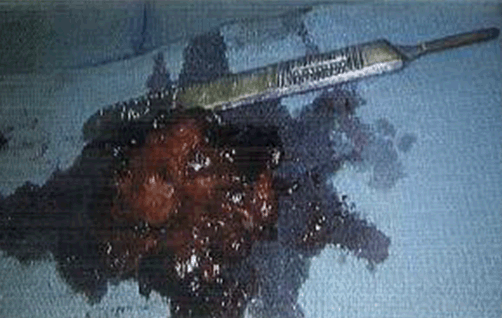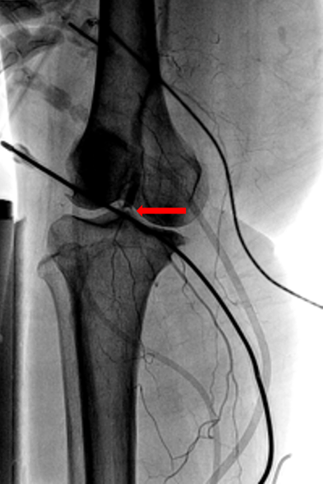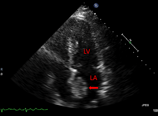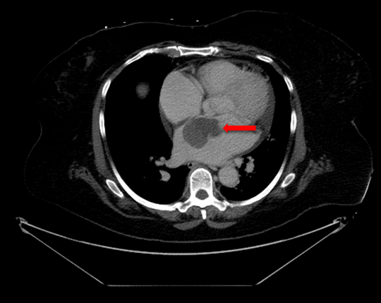 A 66-year-old female with hypertension and hyperlipidemia presented to the emergency department for evaluation of one week of exertional dyspnea and right leg pain. She was a non-smoker and she had no history of peripheral arterial disease, hyperthyroidism or alcohol use. Upon presentation, she was hemodynamically stable. Physical examination was remarkable for irregular tachycardia, hypertension and diminished right pedal arterial pulses. No cardiac murmurs or focal neurological deficits were noted. Telemetry and electrocardiography were consistent with atrial fibrillation with rapid ventricular response. The patient denied a prior history of such arrhythmia. Rate control was achieved with diltiazem infusion and anticoagulation with intravenous heparin was initiated. Echocardiogram showed a left atrial mass adjacent to the interatrial septum suspicious for atrial myxoma (Figure 1). Computed tomography scan showed a left atrial filling defect that enhanced with contrast and measured 4.5x3.3x4.4 cm (Figure 2) as well as a filling defect in the superior mesenteric artery (Figure 3). Lower extremity angiogram demonstrated abrupt cessation of flow consistent with an embolus to the right popliteal artery (Figure 4) and a patent left popliteal artery. Right popliteal arterial thrombectomy was performed. The patient then underwent excision of the left atrial mass. Maze procedure and left atrial appendage ligation. The examination of excised mass revealed an organized thrombus (Figure 5). The postoperative course was uneventful and the patient was discharged on warfarin and metoprolol. | ||||||