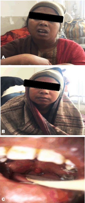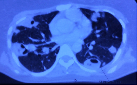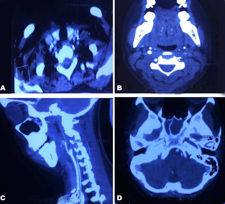 A 34-year-old housewife presented with a short history of fever, and headache for 20 days; odynophagia, neck pain, right sided facial swelling for 10 days; and hemoptysis for five days. The patient denied any history of seizures, altered sensorium, photophobia, and arthralgias. The past history was unremarkable. On examination, the patient was ill looking, tachypneic, and febrile to touch. However, her vitals were normal with pulse rate 104/min, and blood pressure 130/80. General examination showed right sided facial swelling and tenderness along the right sided sternocleidomastoid. Oral examination revealed inflammation of right tonsillar fossa. In the systemic examination, there were fine infraaxillary crepitations in bilateral lungs; and neurological examination showed terminal neck rigidity; while the examination of other systems was unrewarding (Figure 1). Laboratory data showed total leukocyte count 18,650 (normal range 4,500–11,000 per ml) with 86% neutrophils. C-reactive protein (CRP) with value 31 mg/L (normal range 0–10 mg/L) and erythrocyte sedimentation rate (ESR) with value 62 mm/hr (normal range 0–20 mm/hr) were significantly raised; anti-nuclear antibody (ANA), anti-phospholipid antibody (APLA), protein C, protein S, Factor 5 Leiden, antithrombin, homocysteine were normal and HIV was non-reactive. Cerebrospinal fluid analysis revealed 40 cells with 98% lymphocytes while adenosine deaminase (ADA), proteins and sugar were insignificant. Ultrasonography of abdomen and echocardiography were normal. However, electrocardiography showed sinus tachycardia. The chest radiograph showed bilateral patchy shadows with mild bilateral pleural effusion (Figure 2). Magnetic resonance imaging scan of head and neck showed right peritonsillar abscess, thrombosis of bilateral proximal IJV along with the thrombosis of right sigmoid sinus and left retromandibular vein. It also suggested bilateral ethmoid and sphenoid sinusitis/abscess, with extension of abscess to bilateral masticator space caudally and cranially to dura leading to subdural abscess and leptomeningitis. A computed tomography angiography chest (Figure 3) and neck (Figure 4) was done which revealed thrombosed left internal carotid artery (ICA), partially thrombosed left IJV, sphenoid sinusitis and cavitation in bilateral lung fields suggestive of septic emboli. Color doppler bilateral neck was done to assess the extension of thrombus in the vessels. Surprisingly, it showed involvement of both IJV (partially occluded) and ICA (80% occluded) of left side. Blood (anaerobic and aerobic), urine, sputum, and throat cultures were negative as the patient had received antibiotics prior to admission in our hospital. The patient was given intravenously ceftriaxone (1 g q12 h), vancomycin (1 g q12 h), and clindamycin (600 mg q8 h) for 4 weeks. She also received anticoagulation with LMW heparin (6 mg SC q12 h) and acenocoumarol (2 mg q24h) and INR was monitored subsequently. The patient responded to the therapy as evident on radiographic resolution of the thrombosis both in internal jugular vein and internal carotid artery. | ||||||