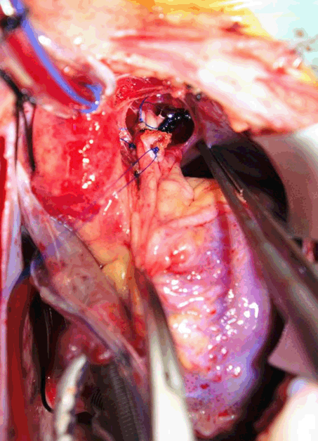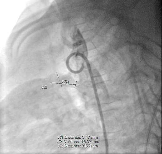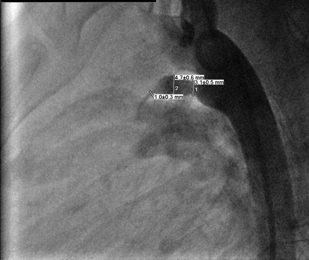A five-year-old girl with history of premature birth and normal vaginal delivery, since then she was completely normal and had regular follow-up with her pediatrician. During routine checkup at age four year, found to have abnormal heart sound on physical examination of the chest by her pediatrician without aving any signs and symptoms. Then she was referred to pediatric cardiologist, found to have a non-restrictive medium sized patent ductus arteriosus (3.3 mm) with mild left ventricular enlargement, trivial MR and mildly increased pulmonary pressure by transthoracic echocardiography without evidence of any other congenital heart anomaly. On physical examination, she was normal for her height and weight, no any signs of respiratory distress, no cyanosis and no clubbing. Vital signs were normal. On chest examination no any deformity found, no thrill, with grade three continuous machinery murmurs in the left upper sternal boarder. Both electrocardiography and chest radiography were normal. The patient was arranged to have a cardiac catheterization with trial of closure of the PDA if possible, her PDA was type D subtype (complex duct with multiple constrictions) with aortic side is 3.1 mm *midpoint 4.7 *pulmonary end 1.0 mm (Figure 1) but because of unavailability of occluder devices, closure was postponed. During her follow-up with cardiologist, no any additional echocardiographic change was noticed. Only during physical examination found to have grade 4 thrill with radiation to the neck. She was arranged for another cardiac catheterization for trail of closure once occluder devices became available in our center after 15 months from first catheterization. During the second catheterization aneurysmal change seen at the pulmonary end rather than aortic end of the PDA with aortic end 3.4 mm* midpoint 7.5 mm* pulmonary end 15.9 mm (Figure 2), so decision was made for surgical closure rather than trial of occlusion with a occluder devices (Figure 3). Surgery was performed after nearly one month from catheterization, under general anesthesia and median sternotomy, cardiopulmonary by-pass without cardioplegia or circulatory arrest. Aneurysm found at the pulmonary end, simple ligation with non-absorbable suture material then aneurysmorrhaphy done at both pulmonary and aortic end with a pericardial pledged, smooth postoperative period without any complication. Immediate postoperative echocardiography showed trivial shunt across the PDA but with a week later no shunt was seen across the PDA anymore (Figure 4). | ||||||