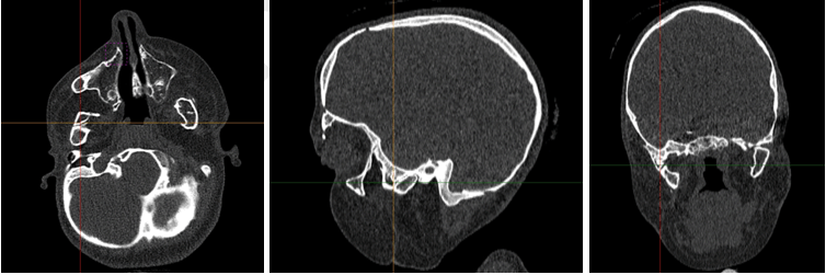 Figure 1: Preoperative axial, sagittal and coronal computed tomography images demonstrating bilateral temporamandibular joint ankylosis, right more prominent than left.