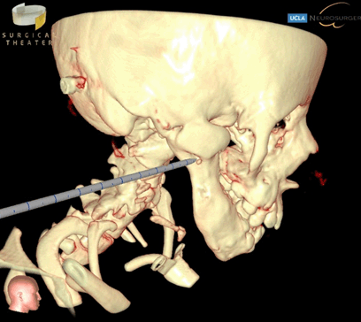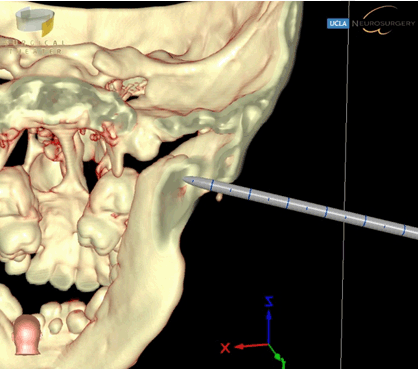 Figure 3: Coronal view of 3D precision VR showing extent of temporamandibular joint ankylosis surgical entry in relation to position of instrument probe. This allowed surgeon to manipulate the model to exact slice and orientation, allowing quick and accurate spatial location of extent of surgical dissection, speed and accuracy compared to navigating off of three 2D slices.