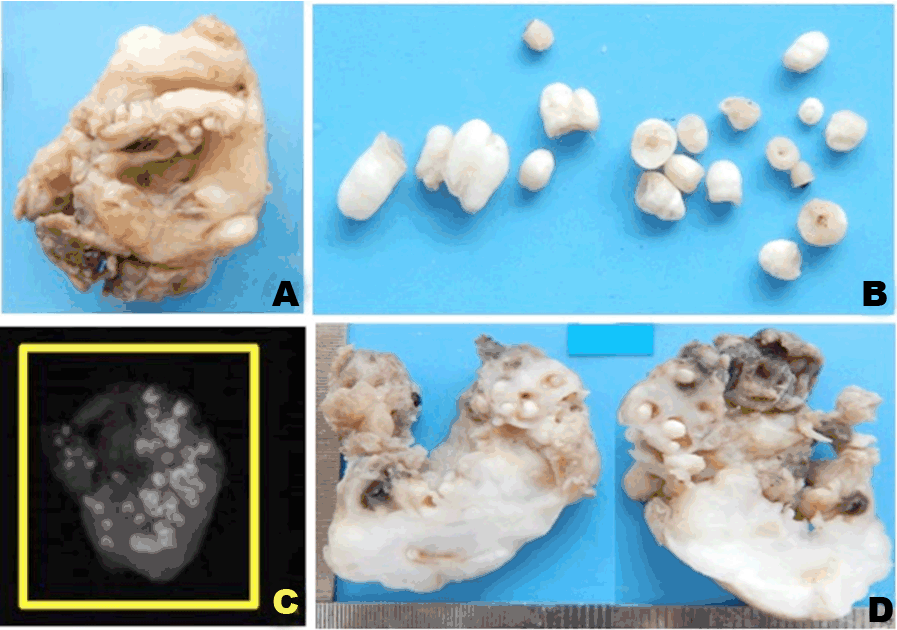 Figure 2: (A, B) Irregular soft tissue mass with numerous tooth crown like structures obtained on excisional biopsy, (C) Radiograph of the gross specimen showing numerous radio-opacities within the soft tissue lesion, and (D) Cut section of 4.5x4 cm of soft tissue specimen showing off-white myxoid areas along with whitish-brown areas with the presence of numerous hard tissues resembling denticles.