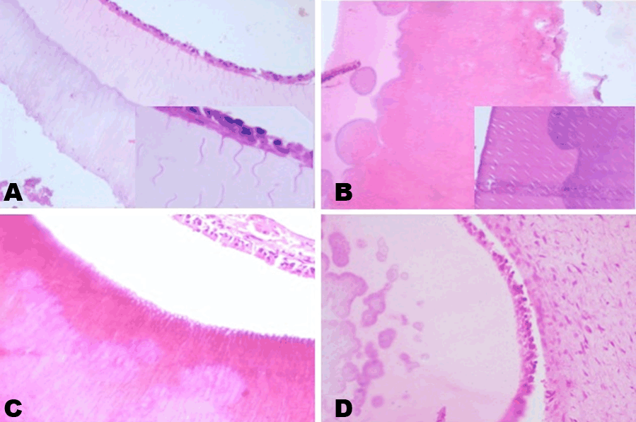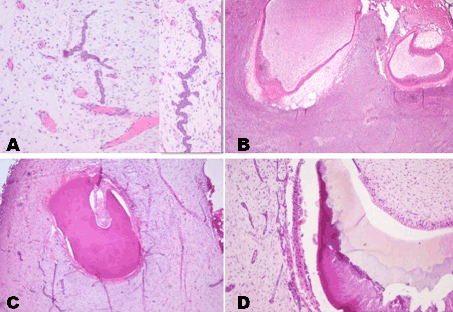 Figure 3: (A) Photomicrograph showing proliferation of dental lamina in the form of cords and strands in an ectomesenchymal background along with engorged capillaries (H&E stain x100). Inset: Higher magnification of the odontogenic epithelial strands (H&E stain, x200), (B) Dental follicles resembling bell stage surrounded by primitive ectomesenchymal tissue (H&E stain, x40), (C) Dental follicle showing predominantly hard tissue formation with strands and cords of dental lamina in the stroma, and (D) Dental follicle in advanced bell stage with formation of enamel, dentin and pre-dentin (H&E stain, x100).
