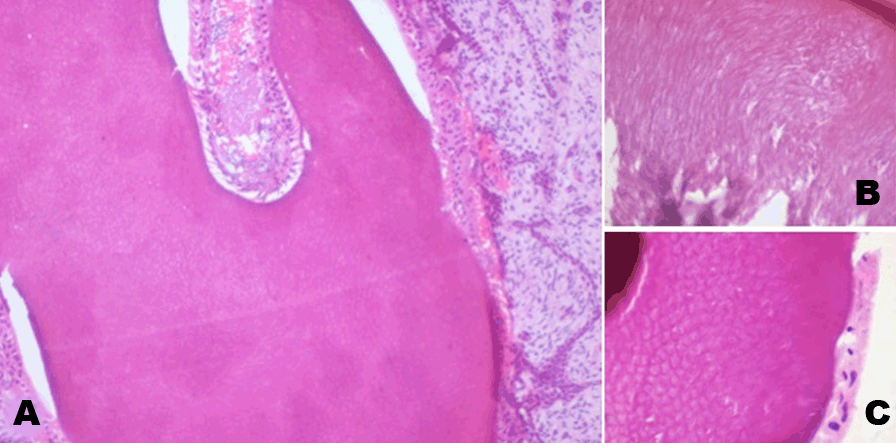 Figure 4: (A) Histologic section showing presence of enamel organ comprised mainly of enamel and dental papilla on a primitive ectomesenchymal background with strands and cords of odontogenic epithelium of about 2–3 cells in thickness. (H&E stain, x100) (B) Higher magnification showing arrangement of enamel rods. (H&E stain, x400) (C) Higher magnification of enamel showing ‘fish scale’ pattern of arrangement of the enamel rods. (H&E stain, x400).