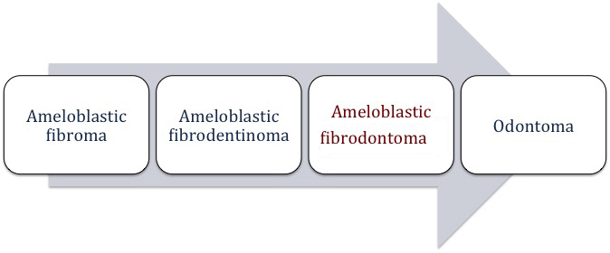 Ameloblastic fibro-odontoma bears resemblance to ameloblastic fibroma, ameloblastic fibrodentinoma and odontomes because of which investigators have hypothesized that ameloblastic fibro-odontoma could be one entity in different stages of development, in which: ameloblastic fibroma evolves to ameloblastic fibrodentinoma (AFD); ameloblastic fibrodentinoma evolves to ameloblastic fibro-odontoma and ameloblastic fibro-odontoma matures to an odontoma (Figure 6). However, the clinical age association, site of occurrence, histopathology, gender and evidence clearly shows a disagreeable point in the continuous differentiation hypothesis proposed by Cahn and Blum [5][6] .