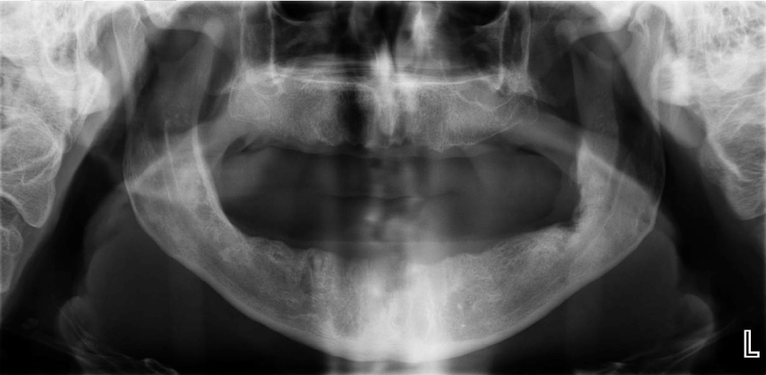 A 54-year-old edentulous man was referred to our outpatient department, complaining of a pain in the deep lingual aspect of the mandible on his left side, when he was wearing his lower denture. His past medical history was free and his surgical history only comprised of an appendicectomy. A bulge that was thought to be arising lingually of the left inferior 3rd molar post-extraction socket, right under the internal oblique line, was palpated upon clinical examination and the patient was scheduled for surgical removal of the diagnosed exostosis in order to relieve his relentless pain. Before proceeding in the operation, the patient was radiographically assessed, but nothing unusual was noticed (Figure 1). In the operating room, we performed left inferior alveolar nerve block along with several lingual and parietal local infusions. Then we went on with a longitudinal incision on the edentulous alveolar ridge of the left mandible and we raised the mucoalveolar flap. This revealed an absolutely normal bone surface and at the same time an abnormal mass within the corresponding soft tissues. Initially, it was thought to be a residual root of the 3rd molar (Figure 2), which was extracted several years before. This was a two step procedure for an initial unsuccessful attempt from a dentist was followed by an oral surgeon’s intervention. Then as we tried to pull out the foreign object, we surprisingly discovered that it was a suction tip (Figure 3). After removing it, the wound was closed with continuous locked suture (Figure 4). The patient was prescribed antibiotics and analgesics and was discharged. | ||||||