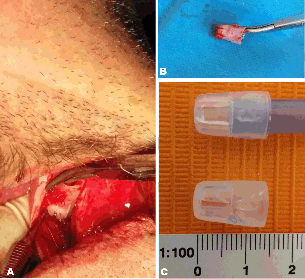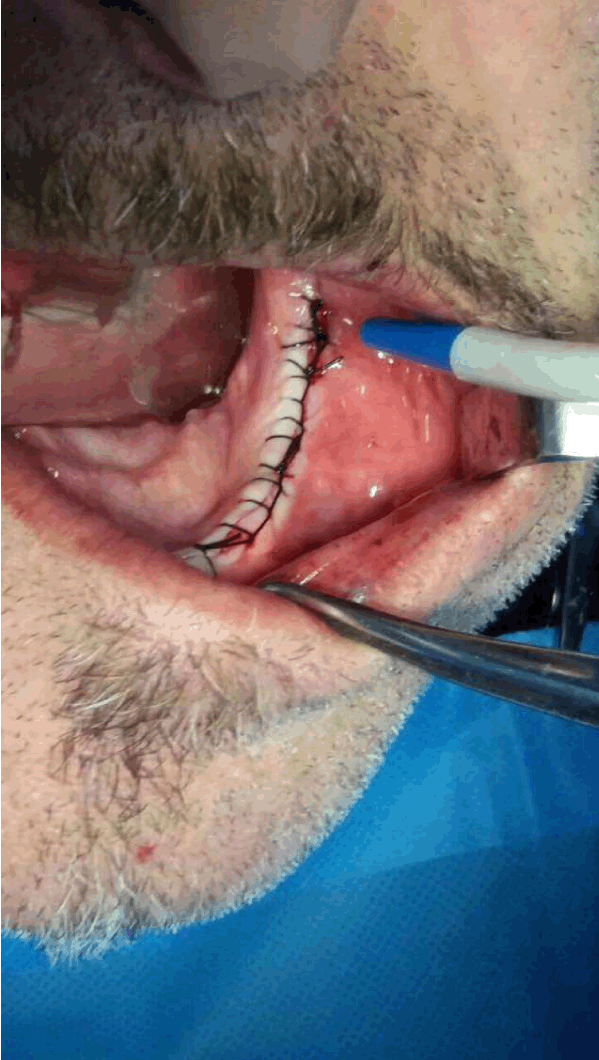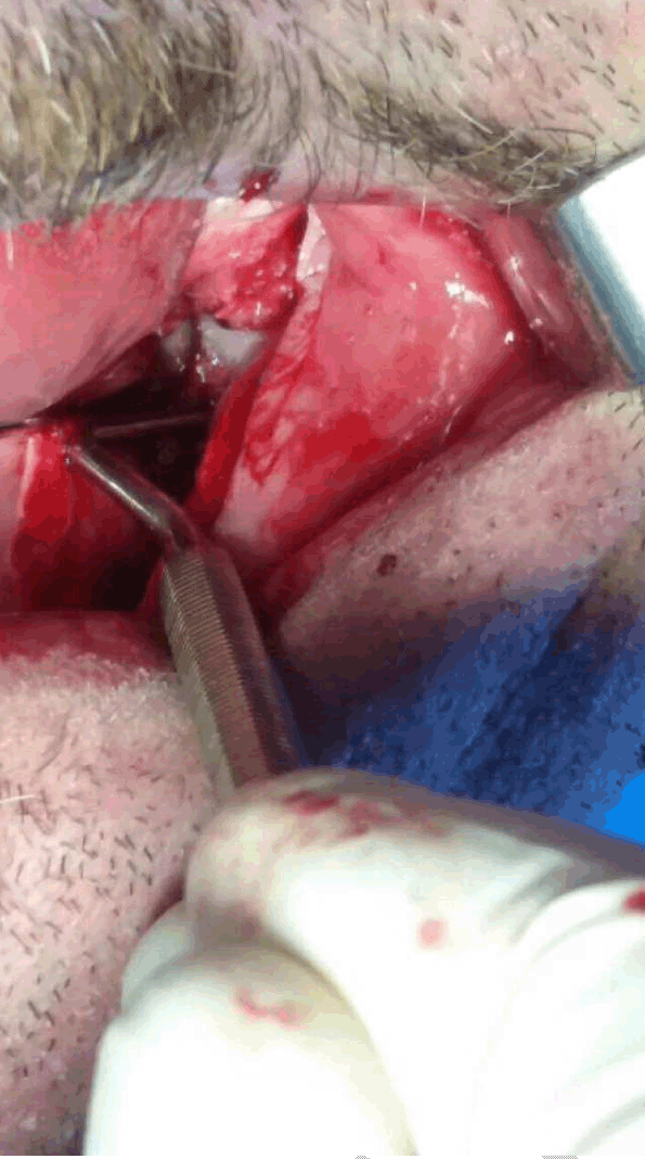 Coming across a foreign body in the oral cavity is an uncommon event. Foreign bodies can be ingested, aspirated, inserted by certain patient’s habits or even accidentally placed by traumatic or iatrogenic injury. They can be fractured burr tips, dislocated teeth, dental implants or restorative material. Most of the times, the foreign bodies are made of plastic, metal, glass and they can be identified on X-ray, computed-tomography (CT) scan and magnetic resonance imaging (MRI) scan [1]. When it comes to the occurrence of an adverse event in relation with dental practice, oral surgery comes third [2]. At the same time cases with residual foreign bodies related to oral and maxillofacial surgery are extremely rare [3]. The majority of them can induce tissue reactions, such an abscess formation, or even a septicemic or a hemorrhagic event. They may also cause pain, discomfort, functional disorders and infection, but they do not usually threat patient’s life [1][4]. Retrieval of foreign objects can be a challenging and difficult aspect of the therapeutic approach, mostly due to the restricted access of the oral cavity and the close anatomic relations of the foreign body with vital structures, while normal anatomy may also come up with variations [1][5]. The aim of this case report is to present a case of a patient with an uncommon foreign object in the oral cavity that was identified during surgery. | ||||||