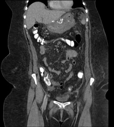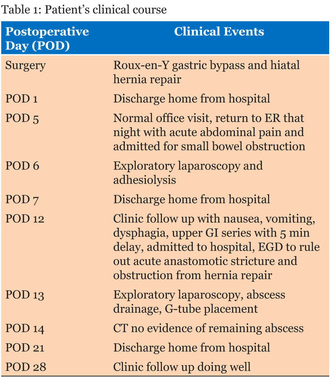 A 50-year-old female presented with a past medical history of gastroesophageal reflux, hypertension, hypothyroidism, inflammatory polyarthropathy, and obesity with a BMI of 44 kg/m2. Her surgical history included tonsillectomy, hysterectomy, cholecystectomy, and left knee replacement. Her medications included omeprazole, plaquenil, levothyroxine, and liothyronine. The patient underwent laparoscopic Roux-en-Y gastric bypass and hiatal hernia repair. She tolerated the procedure well, was functioning within normal limits, and was subsequently discharged on postoperative day-1. The patient was doing well on her follow-up appointment on postoperative day-5 where she was tolerating 80 oz of fluid a day; well above the minimum requirement. However, a few hours later the patient developed severe cramping epigastric pain, nausea, vomiting, and presented to the emergency department. The patient had a CT scan of her abdomen and pelvis, which showed obstruction at the level of jejunojejunostomy. There was no evidence of a leak or abscess (Figure 2). After intravenous fluid resuscitation, an X-ray of the abdomen and pelvis was performed eight hours later and showed transit of contrast into the ascending and transverse colon (Figure 3). However, given the lack of resolution of her symptoms, she was taken to the operating room urgently. A diagnostic laparoscopy was performed revealing a single adhesion of her jejunojejunostomy down to the base of the mesentery, effectively torsing the distal Roux limb. An adhesiolysis was performed. The patient recovered well, tolerated fluids, and was discharged one day later. However, at her follow-up appointment 12 days post Roux-en-Y and six days post adhesiolysis, the patient again developed nausea, vomiting, epigastric pain and dysphagia. She denied fevers, was not tachycardic, and had no signs or symptoms suggestive of infection. An outpatient Gastrografin swallow test was performed. The films were interpreted as showing no evidence of anastomotic obstruction or leak. However, it was suggestive of significant narrowing of the gastrojejunal anastomosis site and marked distal esophageal dysmotility as there was a five-minute delay of transit from the distal esophagus into the gastric pouch (Figure 4). Due to her persistent symptoms and impaired oral intake, the patient was directly admitted to the hospital. On admission, the patient received fluid resuscitation for dehydration and pharmacologic management of her nausea and vomiting with rectal Phenergan. The patient was afebrile, had a CBC and CMP within normal limits, and showed no other signs of infection on examination. Upper endoscopy was performed to rule out recurrence of hiatal hernia, stenosis from the repair, or anastomotic problems. It revealed no evidence of stricture or obstruction. Despite these findings, the patient’s persistent nausea, epigastric pain and clinical examination conflicted with these results. A diagnostic laparoscopy for possible revision of gastrojejunal anastomosis, evaluation of hiatal hernia repair, and possible endoscopy were planned for the next day. During the laparoscopy, the jejunojejunostomy did not appear obstructed, although a large amount of edema was appreciated around the distal gastric pouch and by the liver. While defining the borders of the gastrojejunal anastomosis and gastric pouch, there was a sudden rush of purulent fluid. A cavity of purulent fluid was revealed, extending below the left lobe of the liver and medial to the gastric pouch beneath the gastrohepatic ligament. The location of the abscess suggested possible impingement on the gastric pouch and pressure on the gastroesophageal junction. The purulence was completely aspirated, a Blake drain was placed in the abscess cavity, and a gastrostomy tube was placed in the gastric remnant for nutritional support. Intraoperative anastomotic leak test revealed no evidence of current leakage of contents into the abdomen. The remainder of the surgery was uneventful and the patient was placed on empiric piperacillin/tazobactam and infectious disease was consulted. Culture of the abscess revealed Hemophilus parainfluenza and Prevotella species, normal oral flora. Infectious disease recommended modifying antibiotic therapy to a two-week course of ampicillin/sulbactam and a repeat abdominal CT scan to evaluate for remaining abscesses. Computed tomography scan of abdomen and pelvis with intravenous contrast taken on day-1 post laparoscopy showed an edematous, postoperative appearance of the stomach, with gastric tube and drain in good positioning, and no evidence of remaining abscess (Figure 5). Clinically, the patient reported improvement in her abdominal pain and nausea. The patient was advised to continue to meet fluid and protein requirements, with a combination of PO and G-tube feeds, and to advance diet to soft foods as tolerated. One week after discharge, the patient was seen in the office and was doing reasonably well, she reported relatively controlled gastroesophageal reflux and nausea with zantac and zofran, respectively. By this visit the patient had lost 30% of her excess body weight. | ||||||