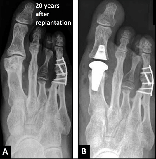 An eight-year-old girl sustained a traumatic amputation of her right foot in the metatarsal level due to a crush injury with an agriculture machine. The midfoot was replanted that was associated with distinctive debridements of soft tissue and metatarsal bones II–IV followed by temporary bony stabilization with the use of Kirschner wires. After that, multiple soft-tissue debridements on the dorsal aspect of midfoot were required (Figure 1), and the soft tissue defect was finally covered with split-thickness skin grafts. Four weeks after replantation, the fourth toe had to be surgically amputated due to a progredient avascular necrosis. Six months after replantation, the medial column of foot was stabilized with reconstruction of the second metatarsal bone loss using a 5-cm long non-vascularized autologous fibular graft that was subperiosteally harvested from her right distal lower leg. The defect of donor site showed completely bony regeneration six months after harvesting, and the fibular graft was completely osseointegrated (Figure 2). Due to a progredient deviation of the fifth toe in medial direction, a fusion of the fifth metatarsophalangeal joint with use of a 2.0 mm titanium compression screw and a 2-mm titanium plate (Synthes) was required seven years after replantation, and the fusion was completely unioned without any complications (Figure 2A). Twenty years after replantation, a distinctive painful posttraumatic osteoarthritis of the first metatarsophalangeal joint was present, and a total joint replacement using the non-cemented TOEFIT-PLUSTM implant (Smith & Nephew) was performed (Figure 2B). Finally, despite posttraumatic decrease in length of the right foot due to growth disturbance there was a good functional and aesthetic result (Figure 3A), and the 28-year-old female is able to perform high-demand activities such as rock walking and alpine skiing in her leisure (Figure 3A). Traumatic amputation injuries of the foot represent a challenging problem, and the success of replantation depends on duration of ischemia, microsurgical expertise, and quality in management of soft tissue complications in the presence of severe crushed wounds[1][2]. In literature, only some case reports could be found in which successful replantations of the forefoot in adults or children have been described [3][4]. In children, replantation of traumatically amputated forefoot should be always tried because the functional loss is low due to the extrinsically-related retaining of ankle functionality. The main problem after forefoot replantations in children is development of growth disturbance resulting in decrease of foot length that was observed in nearly all reported cases, however, this complication is well tolerated. To our knowledge, this is the first case report that describes a successful midfoot replantation in a child with a 20-year follow-up. The use of non-vascularized autologous fibular grafts for reconstruction of bony defects was first reported in 1911 [5], and has proven to be a suitable and reliable option. The main advantage is that this procedure does not need microsurgical expertise. It is important that during fibular harvest, the proximal and distal 5 cm are preserved to prevent injury to the common peroneal nerve and to retain the stability of the ankle joint [6][7], and bony defects with an average length of 7 cm and maximum length up to 15 cm can be reconstructed [8][9]. When the fibular graft is harvested subperiosteally in children, complete bony regeneration of the donor site is always observed [10]. For treatment of metatarsophalangeal joint osteoarthritis, total joint replacement is the motion-preserving alternative to total joint fusion. The non-cemented TOEFIT-PLUSTM is one implant that is currently in use, but still controversial, and should be indicated restrictively in particular in cases when first ray insufficiency is present [11]. When using this implant, it must be noted that there is high surgical revision rate with 24% at a mean of 33 months postoperatively [12]. For failed metatarsophalangeal joint replacement, metatarsophalangeal joint fusion or an excisional arthroplasty are the salvage options [13]. | ||||||