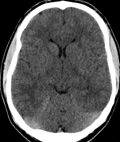 A 19-year-old male presented at the emergency department of the hospital on Saturday morning after a rave party. The patient arrived by ambulance after having had a seizure at the party. Other attendees of the party mentioned that the patient had consumed a large amount of water and (diluted) beer that night and had lost consciousness for a short time. On admission he was orientated with a maximum Glasgow Coma Scale (GCS) score of 15. He denied having used illicit drugs and his medical history was unremarkable. On physical examination the patient’s blood pressure was 147/117 mmHg and the heart rate regular at 114 beats per minute. His pupils were mildly dilated. The cardiovascular and respiratory examination were normal, no crackles were heard. The patient, however, appeared hypervolemic. His face had an edematous appearance and he visited the toilet several times while awaiting the results of the initial investigations. Shortly after being admitted, he experienced tonic-clonic seizure, for which midazolam was administered. To rule out intracranial pathology, a brain computed tomography (CT) scan was performed which showed evidence of cerebral swelling (Figure 1). Laboratory test findings on admission were as follows: sedimentation rate in the first hour: 2 (normal range <15), serum hemoglobin 8.6 mmol/l (normal range 8.5–11.0), leucocytes 13.0x109/l (normal range 4–10), sodium 119 mmol/l (normal range 135–145), creatinine 71 umol/l (normal range 65–110), osmolality 265 mOsmol/kg (normal range 275–300) and CK 1147 U/l (normal range <200). The serum ethanol level was 0.4 (normal range < 0.50/00), while the urine osmolality was 460 mOsmol/kg and the urine sodium level was 113 mmol/l. Urine toxicology screens for XTC and methamphetamine were positive. A diagnosis of acute, symptomatic hyponatremia associated with XTC intoxication was made. The patient was initially treated with hypertonic saline (50 ml of 3% NaCl per hour). The neurologist started the patient on intravenous Depakine to prevent new seizures. Several hours after admission, the patient’s sodium level remained stable at 120 mmol/l. Meanwhile the patient experienced two additional seizures. Due to the patient’s refractory clinical condition, we decided to treat him with a low dose loop diuretic, so 10 mg of furosemide was administered intravenously. A diuresis of 6900 ml in six hours then followed and the hyponatremia was gradually corrected, reaching 137 mmol/l the next morning (24 hours after admission). The patient was discharged from the hospital the following day, without any sequelae. |