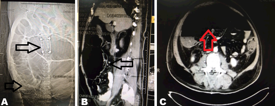 A 44-year-old Egyptian male; not known to have any medical problems before; was admitted as RTA victim. He had recently underwent operative fixation for unstable lumbar spinal fracture five days prior to surgery consultation. He had also a plaster cast applied to a fracture of left ankle. Patient had three-day history of progressive abdominal distension with diffuse pain, nausea and occasional nonbilious non bloody vomiting. Patient did not passed stools or flatus. On general examination, a bedridden obese male having stable vital signs and normal temperature. He was in pain, mildly dehydrated. Locally, the abdomen was diffusely distended with diffuse tenderness maximally over right lower quadrant with rigidity and positive rebound. A tympanic note was noted with sluggish bowel sounds. The rectum was empty. Labworks showed mild leukocytosis with elevated serum creatinine and urea. X-rays of the abdomen showed hugely distended colon. Volvulus then contrast enhanced abdominal and pelvic CT scan confirms the possibility of volvulus of cecum (Figure 1). Resuscitation was started to prepare for surgery and a nasogastric tube was inserted. The situation was fully discussed and informed consent obtained about the need for urgent laparotomy as its late to ask for colonoscopy. Patient was taken to the theatre and the abdomen explored through a long midline incision. Exploration showed intraperitoneal serosanguineous fluid and a hugely distended ischemic right colon up to the right half of the transverse colon with extensive serosal tears and edema of the wall. The cecal diameter exceeded 15 cm. The rest of the colon was distended down the rectum but looked viable. No masses or volvulus were found along the entire colon. The patient was offered right hemicolectomy with right quadrant stoma fashioned (ileostomy and mucus fistula) (Figure 2). The abdomen was closed over a pelvic drain. Postoperatively, he made uneventful recovery and tolerating gradually oral feeding with viable functioning stomas. He was discharged in good condition for possible outpatient department follow-up. | ||||||