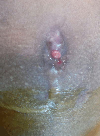 A 27-year-old nulliparous female with history of primary infertility presented with complaint of cyclical bleeding from the abdomen since three years. She had hypomenorrhea and cyclical abdominal pain since menarche. History of laparotomy five years back elsewhere because of mass in abdomen. However, intraoperatively no intervention could be done due to adhesions. After one year she underwent laparoscopy outside but again nothing was done except adhesiolysis. Few months after the second surgery, patient started having blood tinged purulent discharge from anterior abdominal wall scar site. Discharge coincided with menstruation. She had to use 1-2 pads per day at the abdominal site. On examination her built was average, breasts were Tanner stage IV, axillary hair were present and spine was normal. A midline vertical scar was present on her abdomen. Discharge was seen from a small pinkish area on the scar site along with mild induration (Figure 1). A tender cystic mass of 18 weeks size uterus, with restricted mobility was felt towards right.