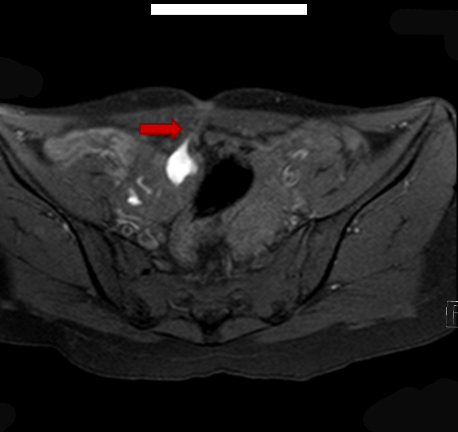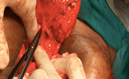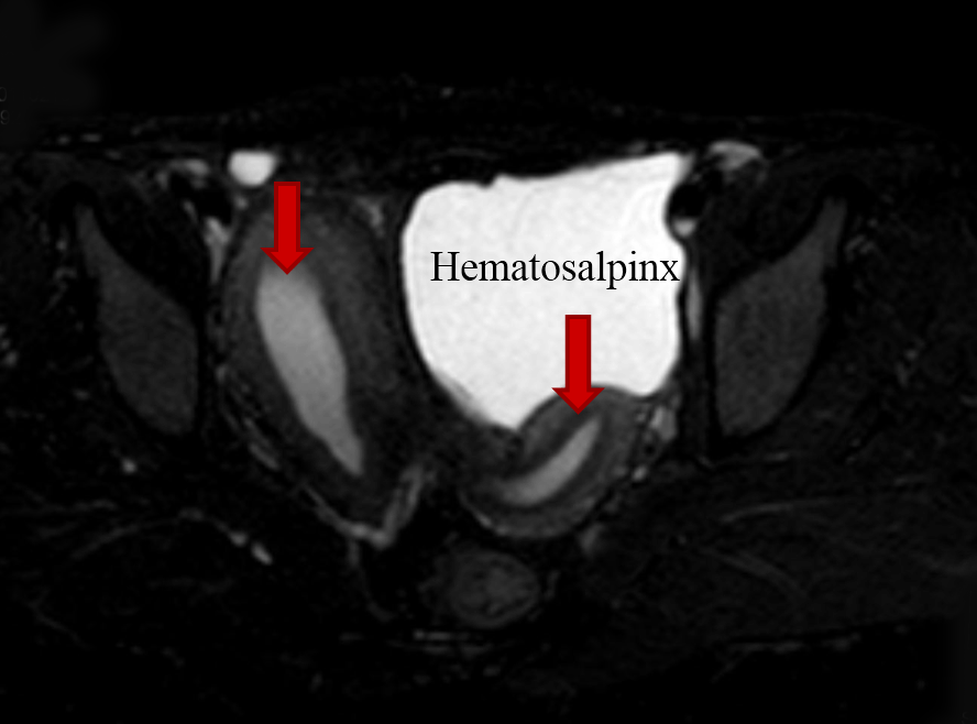 On local examination pubic hair were present, Tanner stage V. On speculum examination cervix was normal but deviated to left. On bimanual examination same mass was felt from right fornix and small size uterus from left fornix. Ultrasonography revealed bicornuate uterus with collection within endometrial cavity of right horn likely non-communicating. Bulky right ovary with a tract noted from it to the scar site on anterior abdominal wall likely scar endometriosis with solitary left kidney. Magnetic resonance imaging scan revealed two uterine cavities with a single cervix and vagina and a left communicating horn and a right non-communicating uterine horn with hematometra and right hematosalpinx (Figure 2). Blood filled tract was extending from the hematosalpinx to the skin opening on the anterior abdominal wall (Figure 3). Patient and her family were counseled and prognosticated about poor fertility potential. She was given the option of excision of the horn. Patient wished to retain her menstrual and child bearing function. She was taken up for laparotomy. Intra operatively fistulous tract was delineated with a probe (Figure 4) and a hypoplastic communicating uterine horn was identified. A right non-communicating normal sized uterus was present. Hysterotomy along with drainage of collection, excision of right hematosalpinx and creation of neovagina was done. A small left uterine horn communicating with the cervix was identified. A new opening was created in the vagina followed by stent insertion and previously non-communicating horn was connected with the vagina. Histopathology showed ulcerated fistulous tract with inflammatory granulation tissue with chronic salpingitis and foci of endometriosis. Patient received oral hormonal pills for three months. Later, there was resumption of normal menstruation with good flow postoperatively along with relief of pain. | ||||||