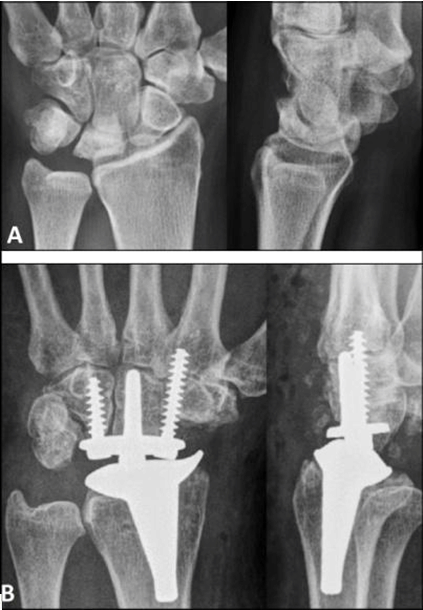 Figure 2: (A) Example for Kienböck's disease stage IIIB with a collapsing lunate in a 54-year-old woman (left wrist), (B) Same patient, treated with another third generation TWA (RE-MOTIONTM Total Wrist).