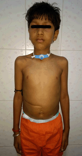 Figure 1: Child with tracheostomy tube in situ with scar of gastroduodenostomy incision.