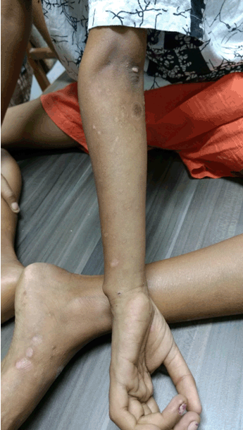 Figure 2: Healed scars of ruptured bullosa over extremities.
