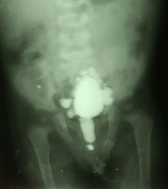 Figure 4: Voiding cystourethrogram showing dilatation and elongation of posterior urethra and bladder trabeculation.