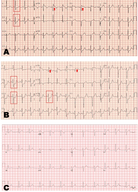 A 75-year-old Asian male with prior history of cerebrovascular accident, type 2 diabetes, hypertension and dementia was brought to the emergency department with a chief complaint of aphasia, left sided facial droop and right sided hemiparesis. Symptoms began acutely at 09:00 a.m. on the day of admission when returning home from church. In the emergency department, blood pressure was initially 137/72 mmHg, heart rate of 86bpm, and electrocardiogram (ECG) showed 0.1 mV ST elevations in aVR and V1, and ST-depression in lead I and II (Figure 1A). Computed tomography scan of head without contrast showed no acute intracranial hemorrhage and the patient was deemed an appropriate candidate for t-PA. After initial t-PA bolus, patient was started on a t-PA infusion. Due to worsening hypertension reaching 200/88 mmHg, he was started on a titratable nicardipine infusion. Transiently, the patient experienced an episode of nausea and vomiting and became hypotensive to 70/45 mmHg leading to the discontinuation of nicardipine. Shortly thereafter, the patient was noted to have new ST changes on telemetry monitor. A second ECG The patient was taken directly to the catheterization laboratory where he was found to have a total occlusion of the distal left main coronary artery (LMCA) which was collateralized from a large, dominant right coronary artery (RCA) that had no obstructive lesions. To confirm that left circulation was chronically occluded, we attempted to wire into the left anterior descending (LAD) artery, but the wire could not cross through the left main stenosis, confirming a chronic occlusion (Figure 2A). |