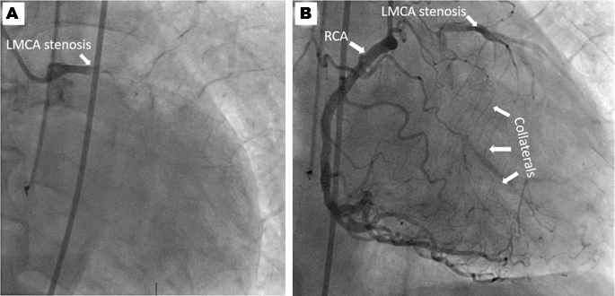 This patient developed a STEMI due to a totally occluded LMCA and hypotensive collateral insufficiency of the RCA in the setting of treatment of an acute ischemic stroke. His coronary angiogram showed a chronically occluded distal LMCA with a dominant RCA and significant collateral circulation (Figure 2B). The patient did not require any immediate revascularization in the catheterization laboratory due to improved mean arterial pressure and improved collateral perfusion. Given recent administration of t-PA, intravenous heparin was not recommended due to increased risk of bleeding. Post-cardiac catheterization and after clearance by neurosurgery and neurology, the patient was started on aspirin and metoprolol succinate. He was managed in the intensive care unit for 48 hours, extubated and transferred to stroke unit. Echocardiogram was performed showing a left ventricular ejection fraction of 40% correlating with moderate systolic dysfunction, and mild concentric left ventricular hypertrophy. Also, the entire anterior, basal and mid anterolateral wall, mid anteroseptal segment, apical lateral segment, and apex were hypokinetic. Grade II diastolic dysfunction was also seen. During his hospital study, the patient was found to have multiple episodes of atrial fibrillation that was rate controlled with digoxin and nicardipine hydrochloride with appropriate response. The patient was eventually planned for staged coronary bypass surgery. However, one week after presentation developed septic shock secondary to aspiration pneumonia and ultimately expired. |