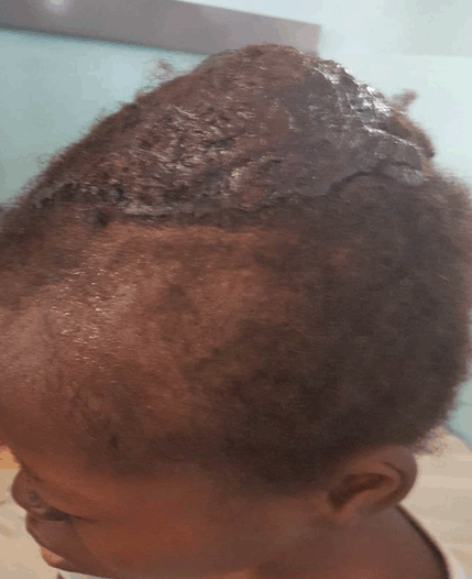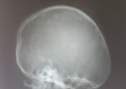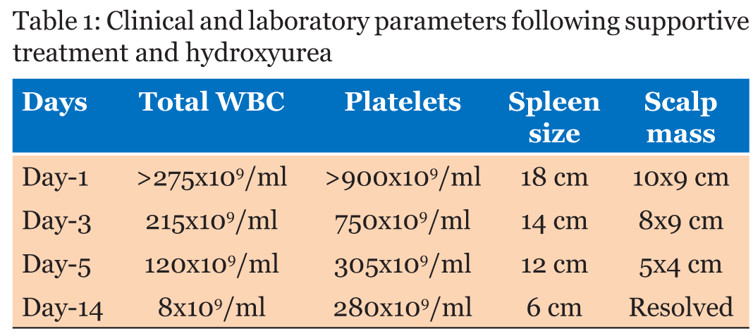 A previously healthy 15-year-old girl was admitted with one-month history of moderate to severe headache, weight loss, fever; one week prior to presentation she developed abnormal sensation in both ears, deviation of angle of the mouth to the left, with inability to close the right eye, and partial drooling of the left eye. Five days before admission, she developed a progressive scalp swelling which was initially the size of a pea, and said to have ruptured and bled spontaneously into the surrounding area, there was no other bleeding episodes. Her past medical history was unremarkable. General examination revealed an irritable and lethargic girl, sweaty, febrile (37.8°C), mildly pale, with a respiratory rate of 26 cycles per minute and pulse rate of 110 beats per minute, there was no peripheral lymphadenopathy. Local examination revealed no purpura or ecchymosis, however, there was a discreet, firm, moderately tender hemorrhagic mass on the scalp, measuring 10x10 cm (Figure 1). Neurological examination revealed no evidence of meningism; there was a right infra nuclear facial nerve palsy. There was partial ptosis of the left eye with otherwise normal ocular movement in all directions (Figure 2), both pupils were reactive to light and accommodation. No other focal neurology was evident. The spleen was palpable 16 cm and the liver 6 cm below their respective costal margins. Complete blood count revealed hematocrit of 28%, total white cell count of 275x109/L and platelets count of 980x109/L. Peripheral blood film (PBF) revealed all spectrum of white blood cells (Figure 3) –myeloblast 3%, promyelocytes 6%, myelocytes 40%, metamyelocytes 12%, band form 19% and neutrophil 20%. Bone marrow aspiration (BMA) cytology showed markedly increased myelopoiesis, the myelogram showed evidence of sequential maturation along the cell line with a peak at the myelocyte stage and myeloblast count of less than 5%. The PBF and BMA were in keeping with CML in chronic phase; rtPCR analysis of whole blood was positive for Philadelphia chromosome and the b3a2 transcript type (classical CML) was detected; quantification revealed BCR-ABL quantity of 4,578 copies per 2.5 micro liter of cDNA, ABL copies of 931,750 per 2.5 ml of cDNA and BCR-ABL/ABL ratio of 0.49%. The serum biochemistry was unremarkable. A skull X-ray revealed no bony involvement by the scalp swelling (Figure 4). Cerebrospinal fluid analysis was negative for malignant cells. Chest X-ray revealed cardiomegaly with right upper lobe opacity. Two-dimensional echocardiogram was performed and showed severe left ventricular dysfunction and dilated left ventricular wall, with increased pulmonary vascular resistance. An assessment of chronic myeloid leukemia presenting with hyperleukocytosis complicated by CNS leukostasis was made. Supportive treatment was started immediately with hydration using normal saline (150 ml/kg), allopurinol 100 mg daily and low dose aspirin (in view of the markedly raised platelets count) for 24 hr, before commencement of cytoreduction with hydroxyurea (40 mg/kg/day QDS). This was to expand the plasma volume and reduce the attendant risk of tumor lysis syndrome that may accompany cytoreduction. The patient showed progressive improvement in both clinical and laboratory parameters 72 hours after admission (Table 1). Her dose of hydroxyurea was titrated based on her total white blood cell count, and by two weeks following cytoreduction with hydroxyurea her WBC was stable at <10x109/L (Table 1). The scalp mass was managed conservatively with daily saline dressing, and resolved completely by day-10 of admission. The patient was referred to another tertiary centre in South west Nigeria where imatinib treatment made available by an international donor agency is given free of charge, however, her parents declined to proceed with any further treatment despite adequate counseling. She was continued on hydroxyurea and regular physiotherapy for her cranial palsy. She remained stable during regular follow-up, however, there was still residual seventh nerve palsy at third month follow-up. | ||||||
